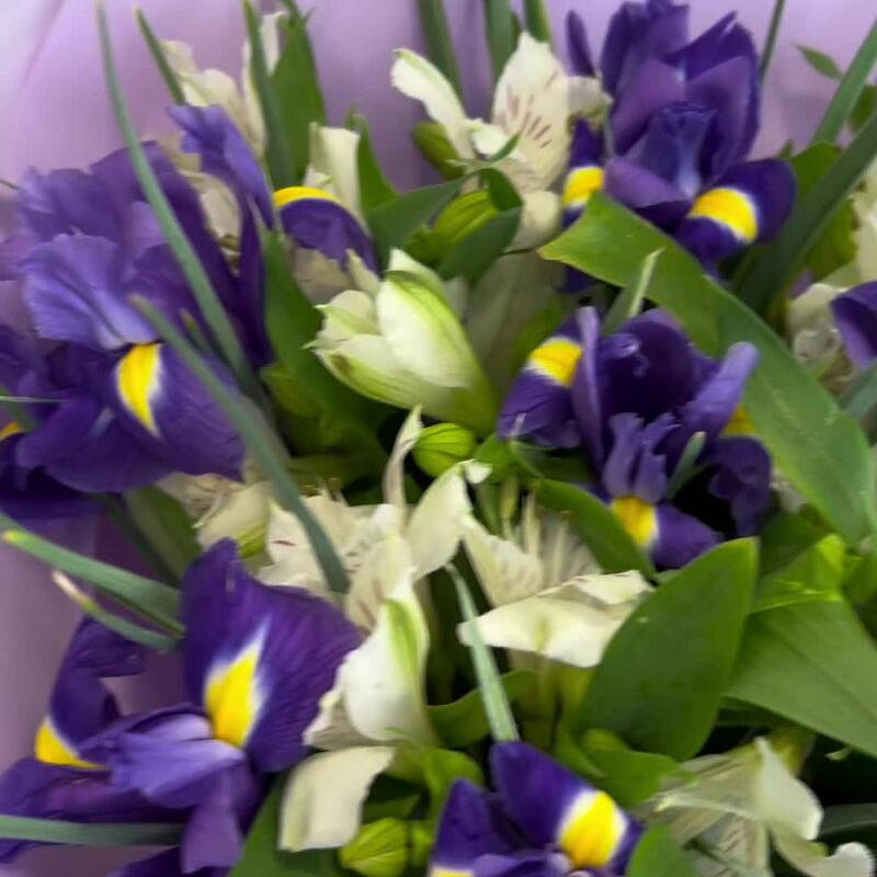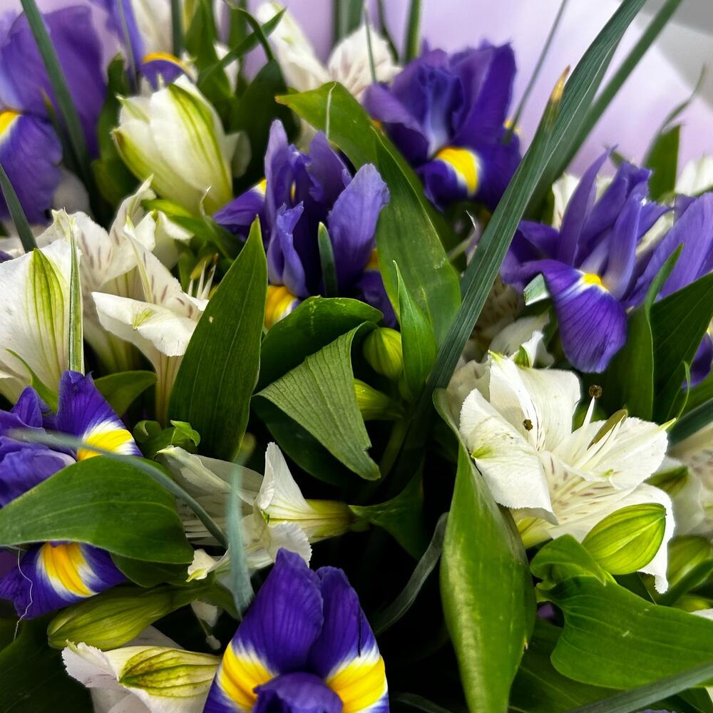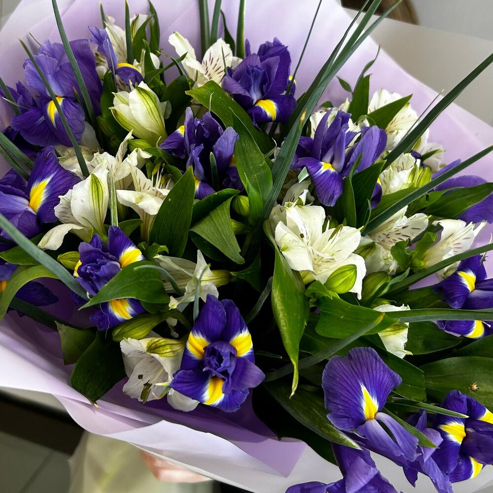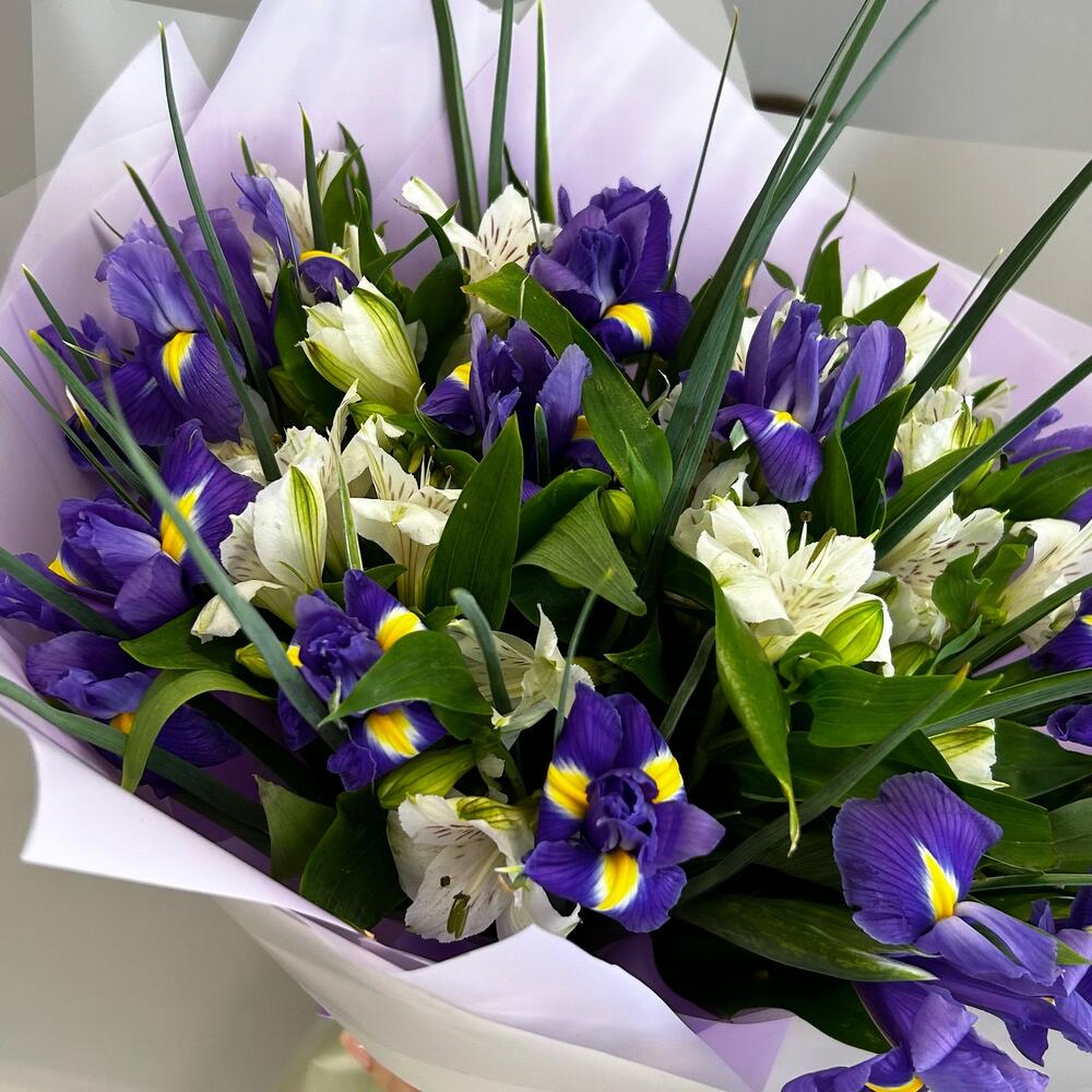 Ирис – 13 шт.Альстромерия – 8 шт.Зелень – 3 шт.Упаковка дизайнерская – 2 шт.Лента атласная – 2 шт.