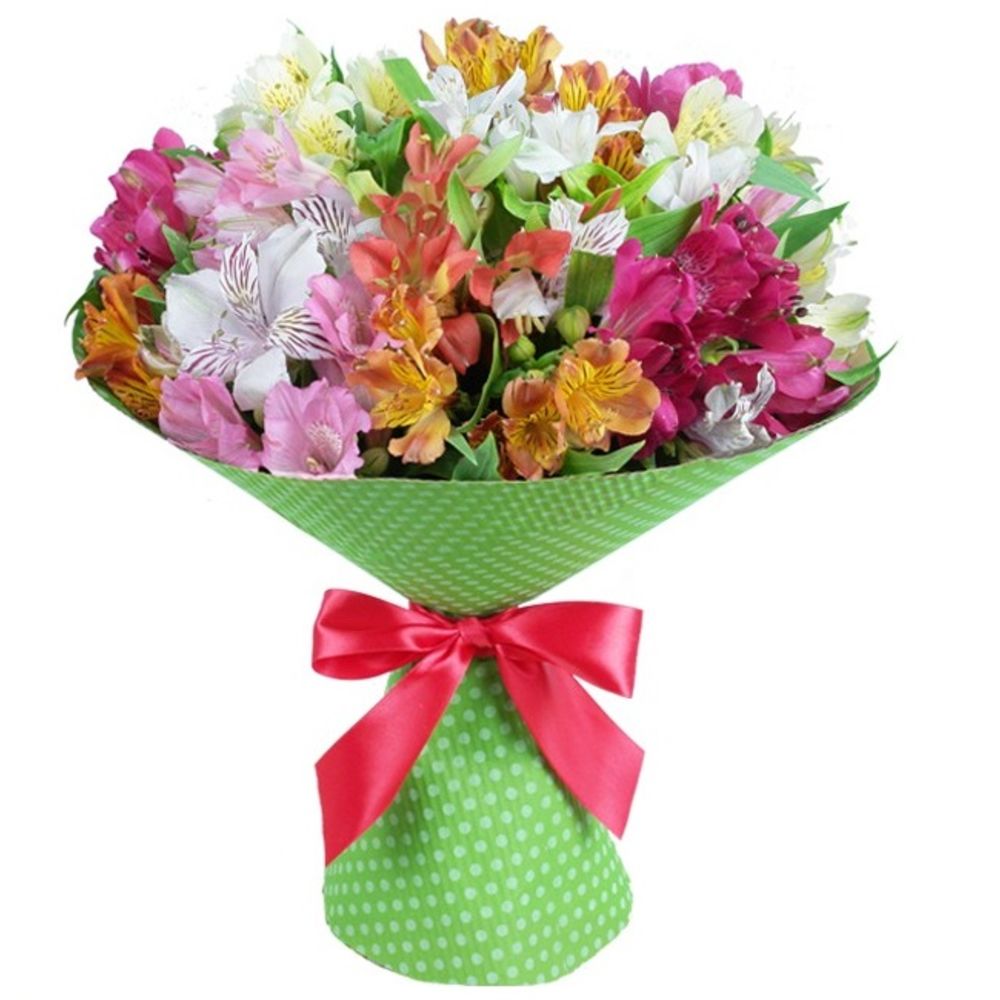 лента декоративная – 1 шт.бумага упаковочная – 1 шт.Альстромерия оранжевая – 5 шт.Альстромерия розовая – 4 шт.Альстромерия малиновая – 5 шт.Альстромерия белая – 5 шт.
