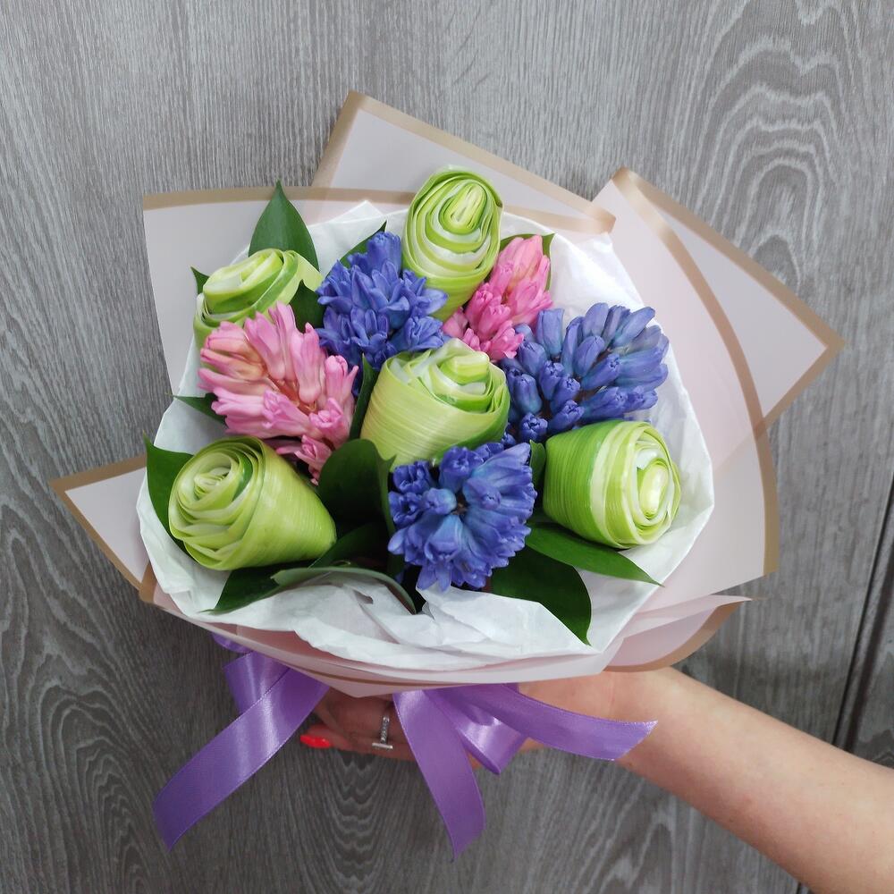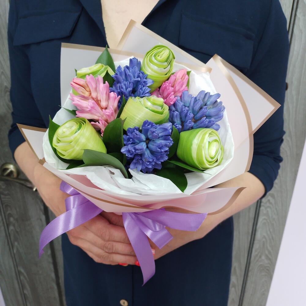 Гиацинт – 5 шт.Рускус – 2 шт.Упаковка дизайнерская – 1 шт.Лента атласная – 1 шт.