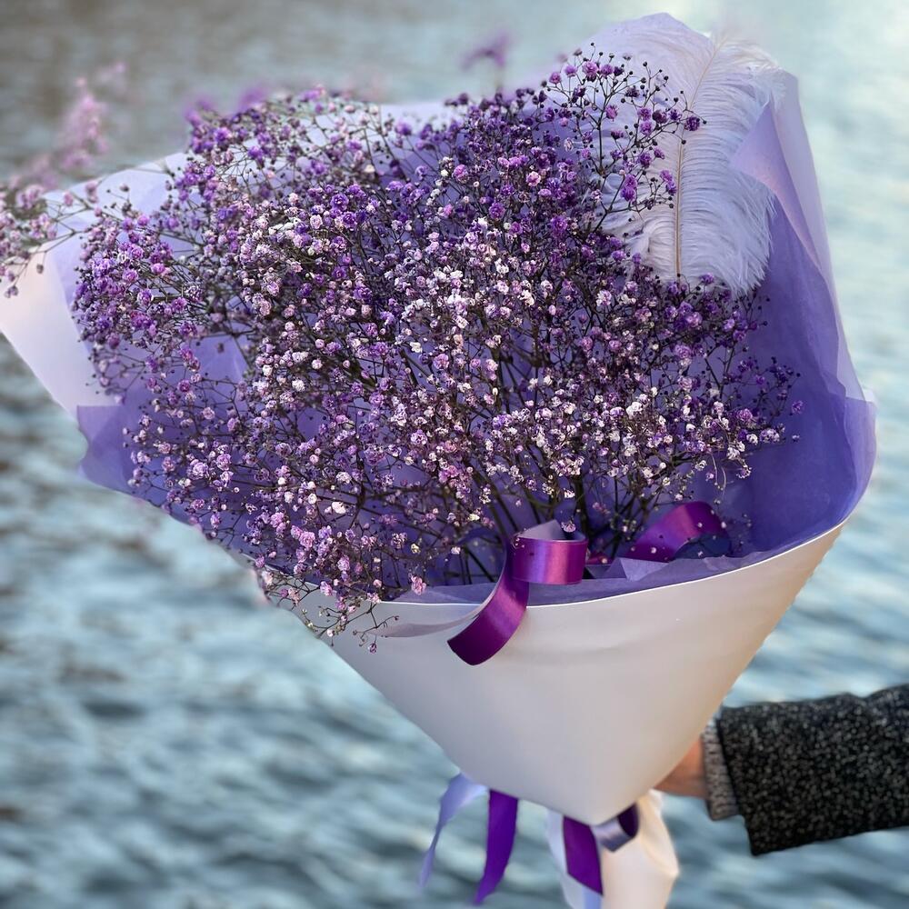 Гипсофила – 7 шт.перо декоративное – 2 шт.Упаковка дизайнерская – 1 шт.ленты атласные – 4 шт.