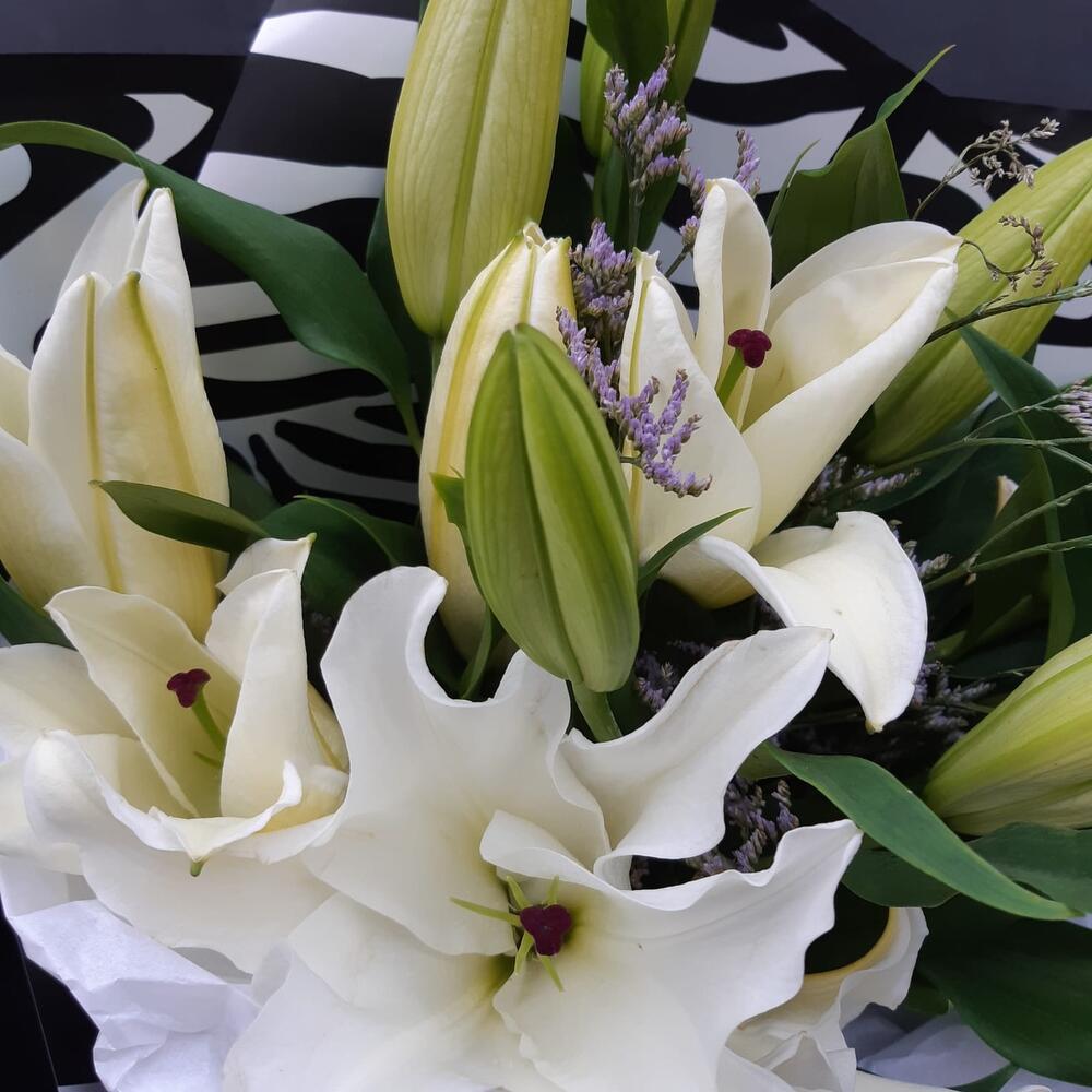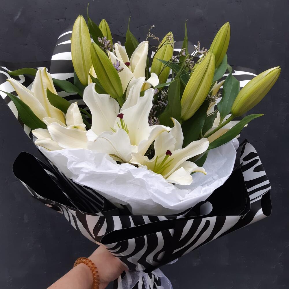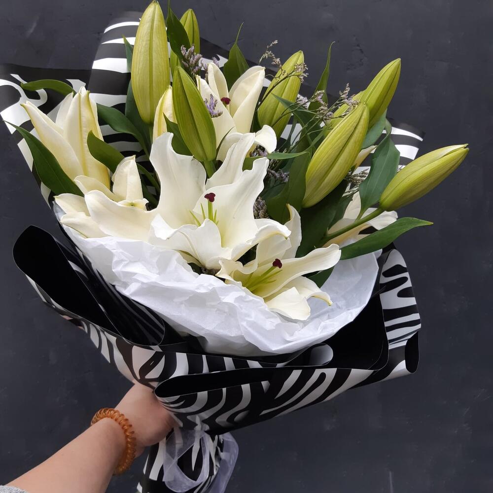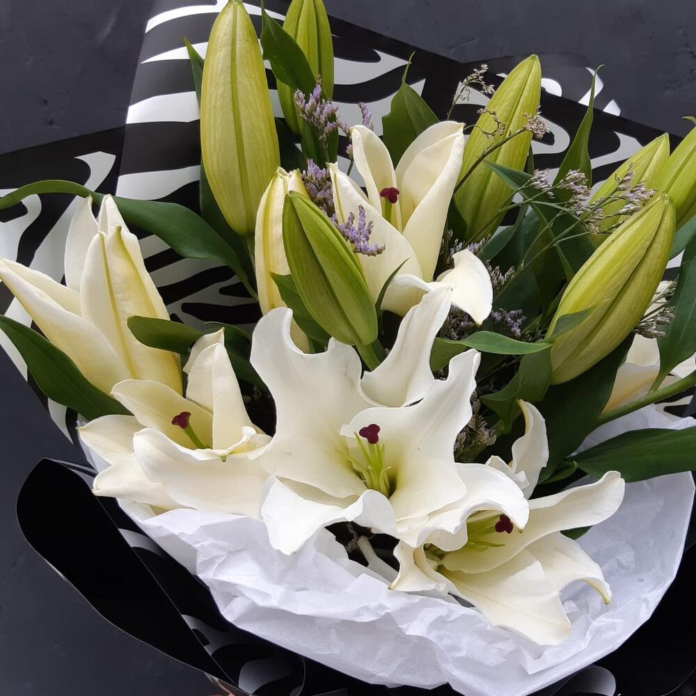 Лилия белая – 5 шт.лимониум или гипсофила или статица – 2 шт.Упаковка дизайнерская – 2 шт.Лента атласная – 1 шт.