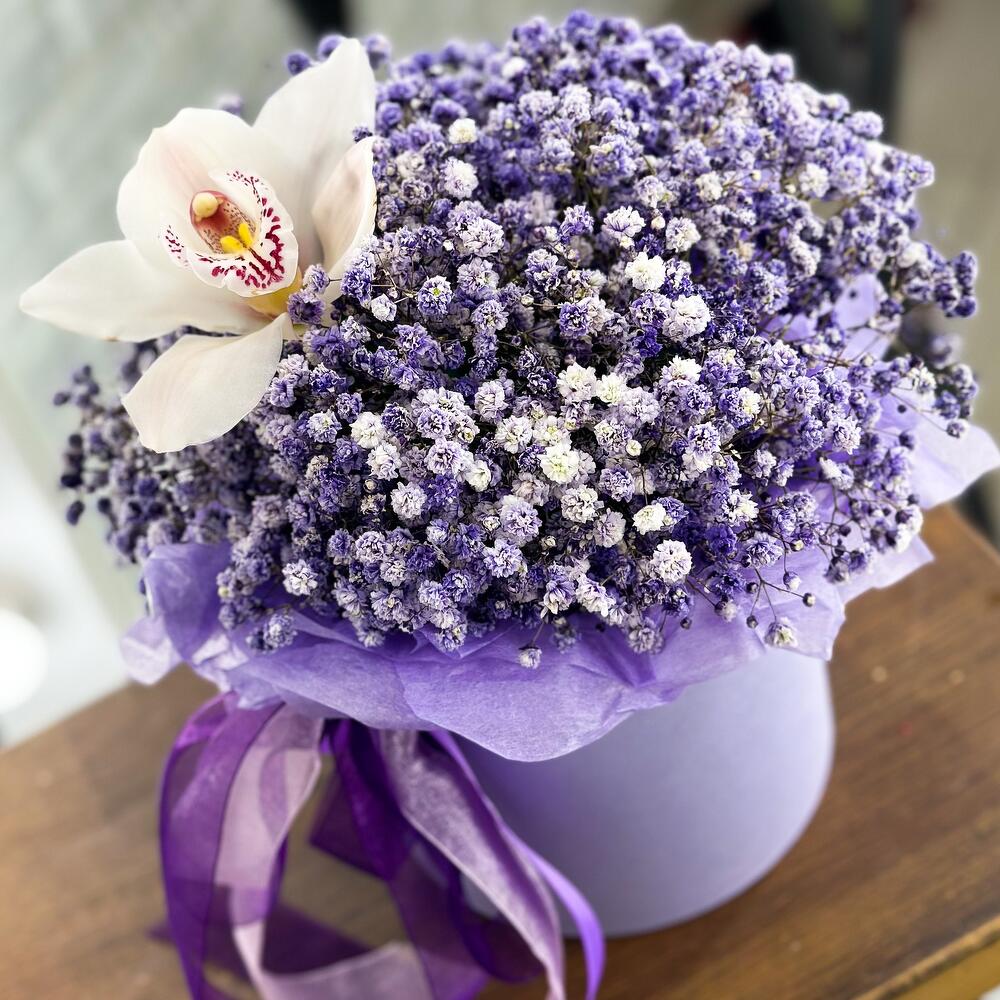 Играющая, сиреневая гипсофила с долгоиграющей Орхидеей собрана в одну стильную шляпную коробку!Благодаря пышности этих цветов,букет смотрится словно воздушный закат уходящий вдаль!Яркий и необычный комплимент для любого повода!Добавляйте товар и магазин в избранное,чтобы было легче нас найти