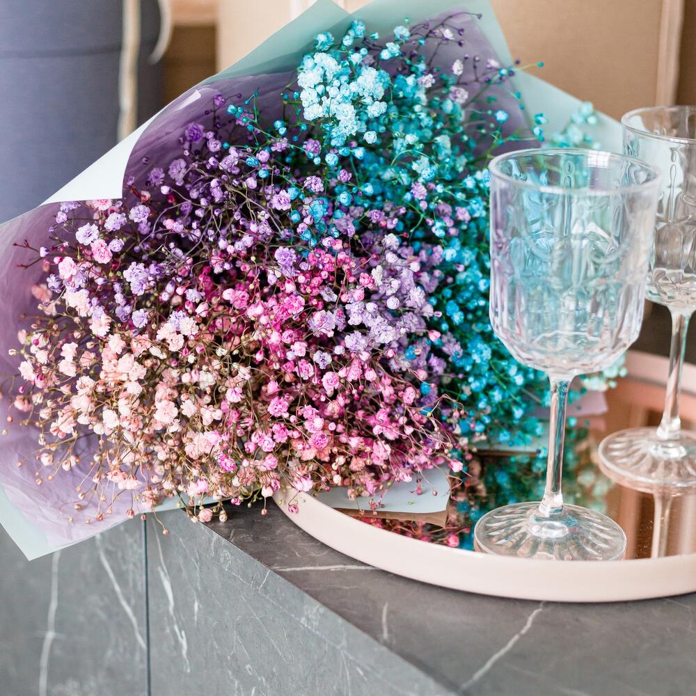 Гипсофила – 7 шт.Упаковка корейская – 2 шт.Лента атласная – 1 шт.