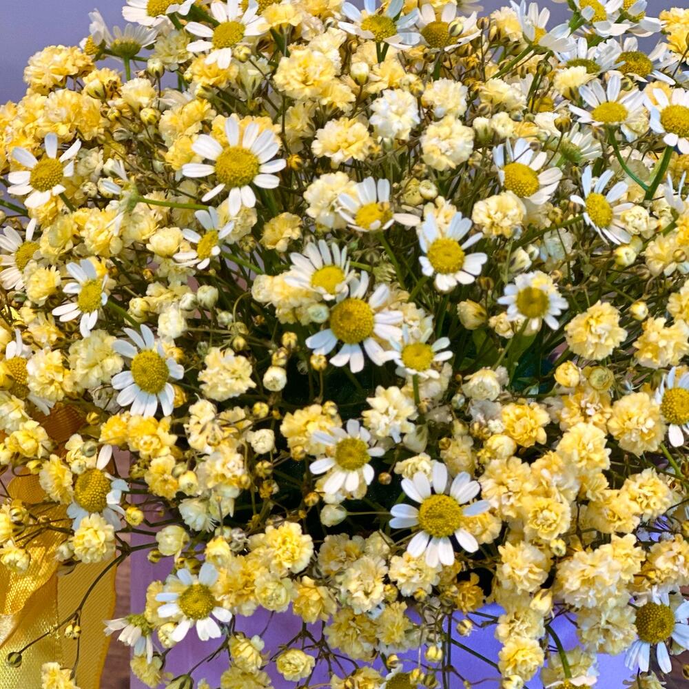 Гипсофила – 3 шт.Лента атласная – 1 шт.Коробка шляпная – 1 шт.Матрикария (Ромашка Камила) – 3 шт.Оазис флористический – 1 шт.