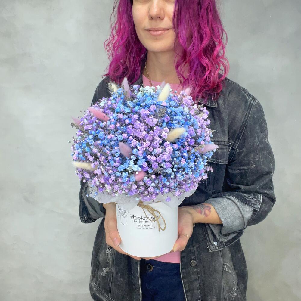 “Сиреневый туман” – композиция из гипсофилы в шляпной коробке