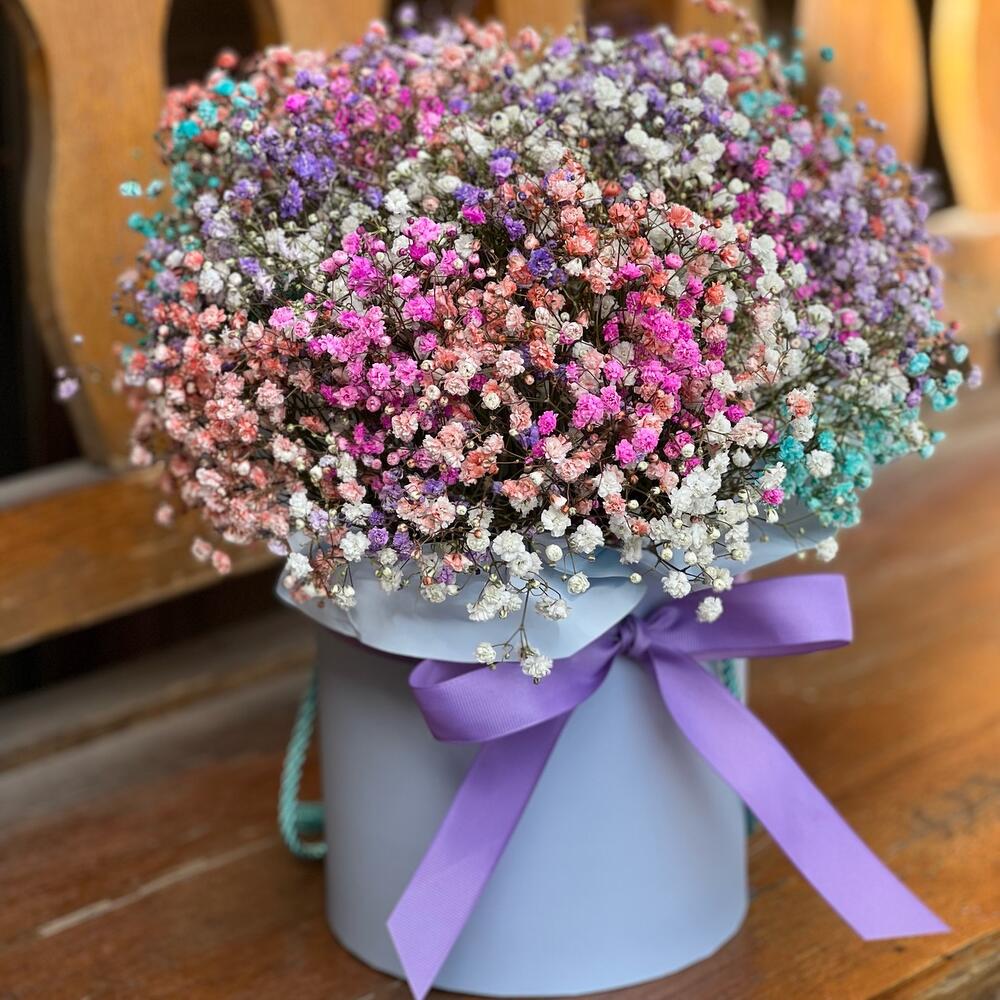 Нежная композиция из радужной голландской гипсофилы в коробочке порадует ваших близких по поводу и без