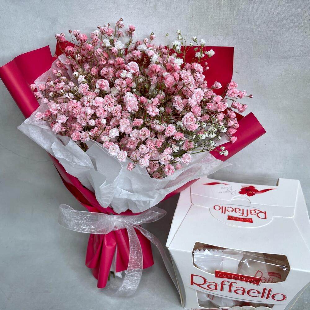Подарочный набор – Букетик гипсофилы (размеры: 25 см высота, 20 см ширина) с коробкой конфет Raffaello. Доставляется в крафтовом пакете (высота 25 см, ширина 22 см, глубина 12 см).
