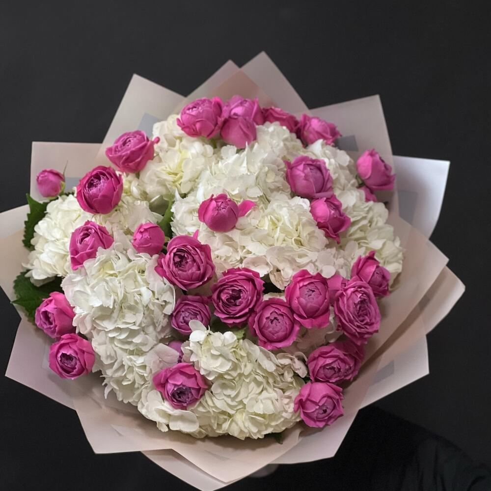 Гортензия – 7 шт.розы кустовые пионовидные – 10 шт.Упаковка дизайнерская – 5 шт.Лента атласная – 1 шт.