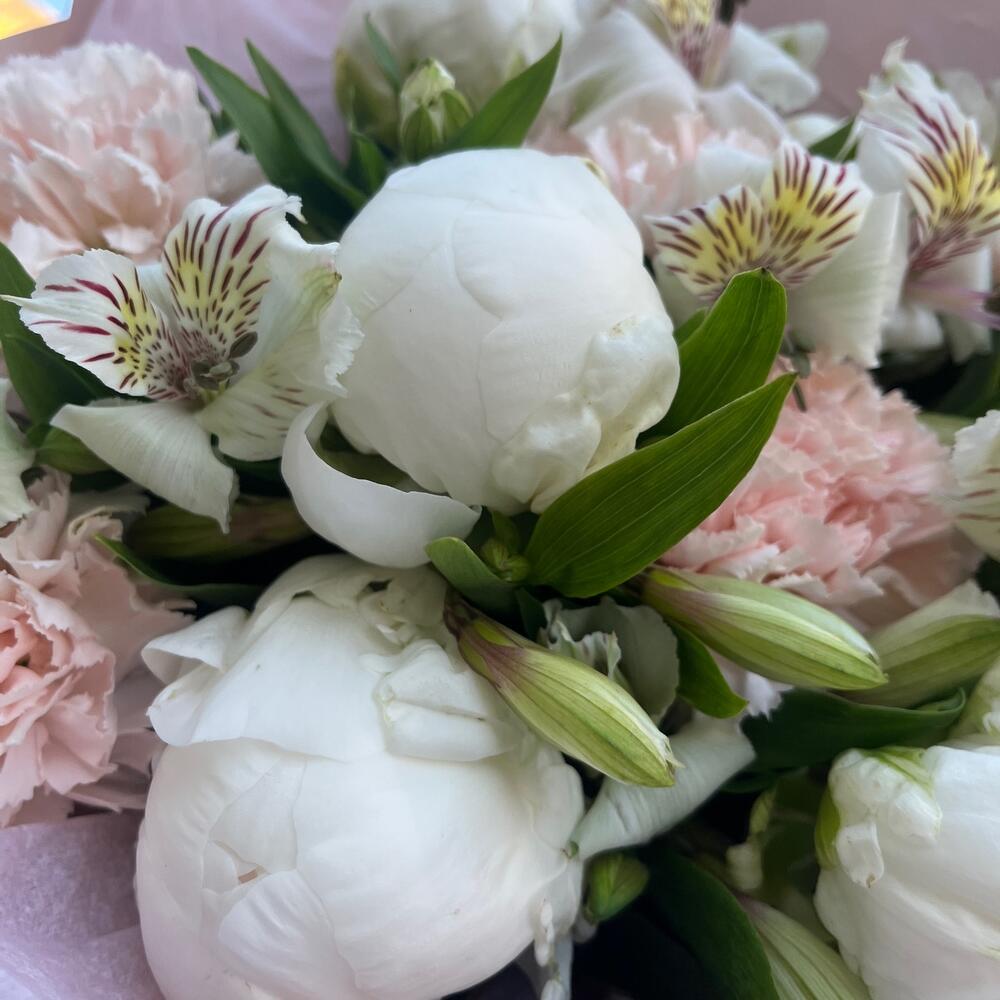 Альстромерия белая – 6 шт.Лента атласная белая – 1 шт.Диантус персиковый – 5 шт.Упаковка корейская пленка – 1 шт.пион белый премиум – 5 шт.тишью нежно-розовое – 1 шт.
