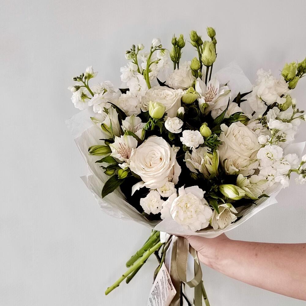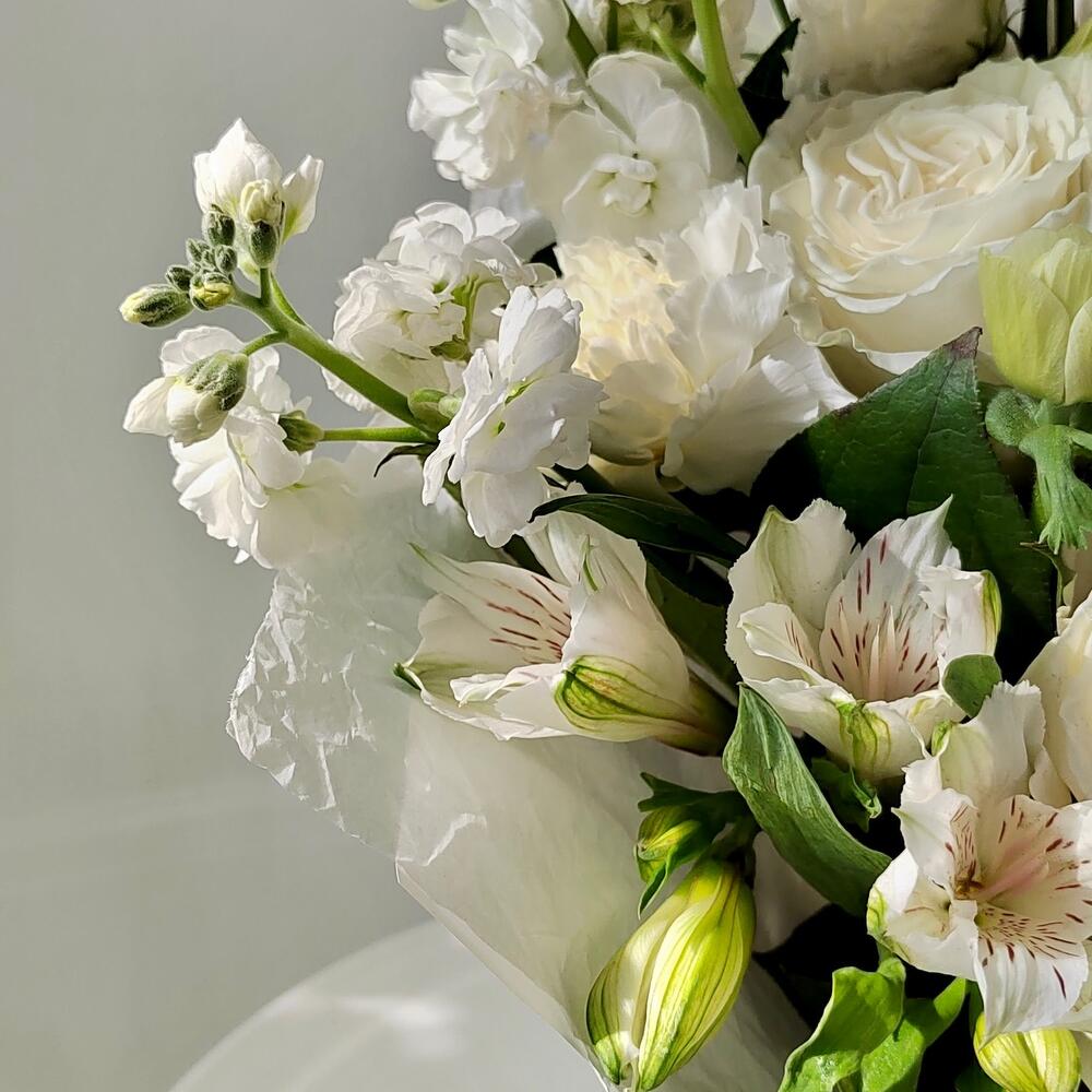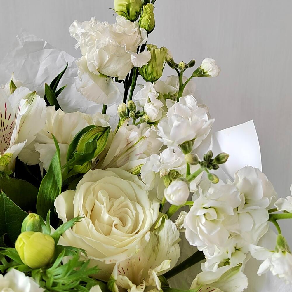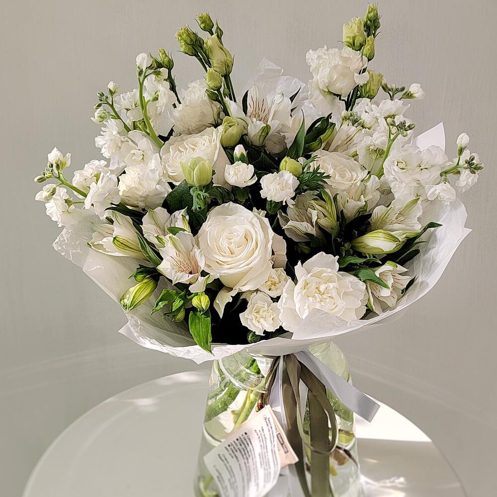 Альстромерия – 3 шт.Маттиола – 3 шт.Эустома – 2 шт.Лента атласная – 4 шт.Упаковка дизайнерская – 5 шт.Роза белая эквадор – 3 шт.гвоздика сортовая белая – 5 шт.зелень фисташка – 3 шт.
