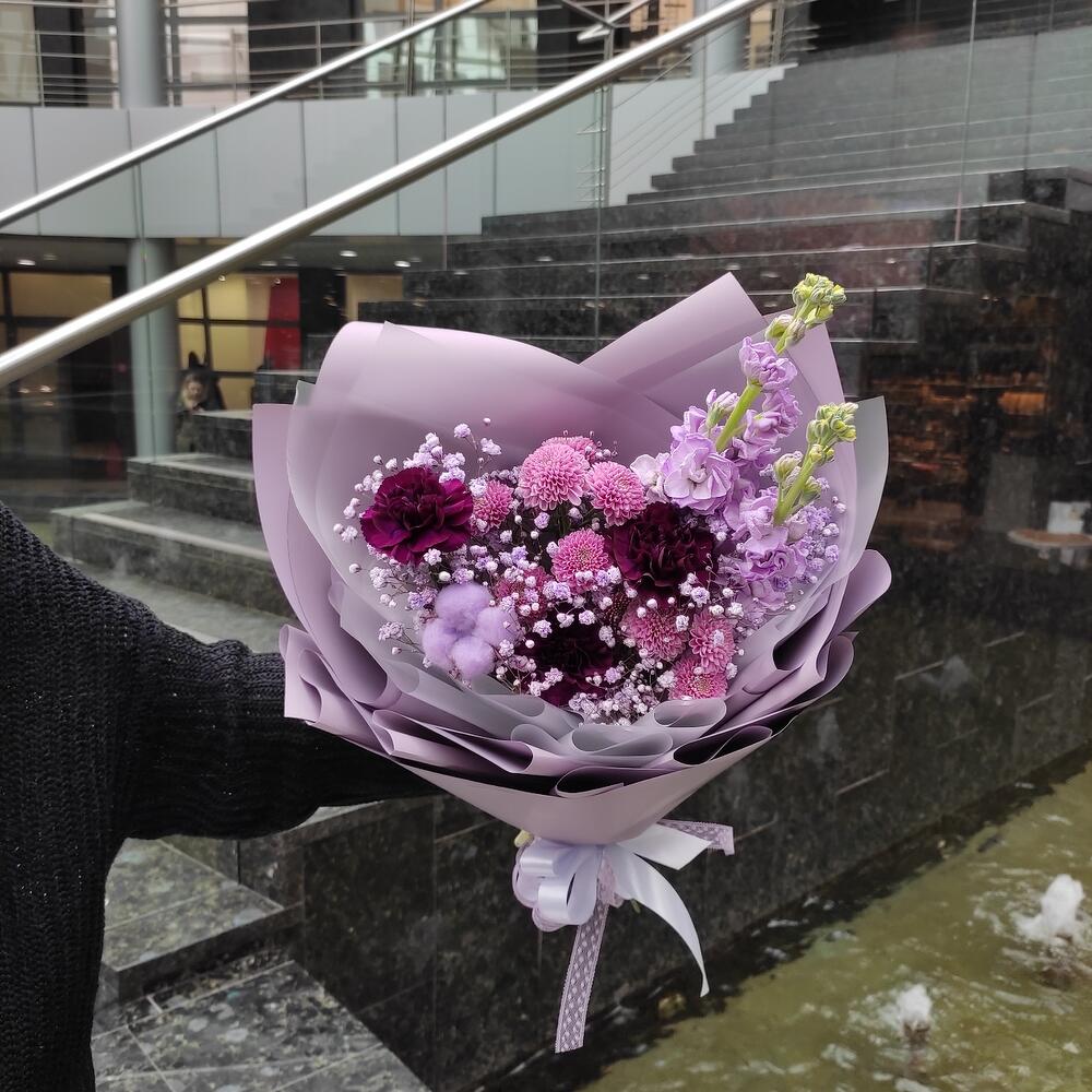 Гвоздика – 3 шт.Хризантема кустовая – 2 шт.Маттиола – 2 шт.Хлопок – 1 шт.Гипсофила – 2 шт.Лента – 2 шт.Упаковка дизайнерская – 2 шт.