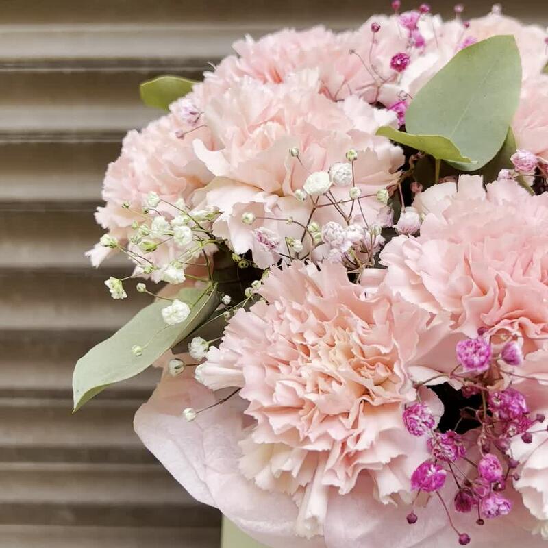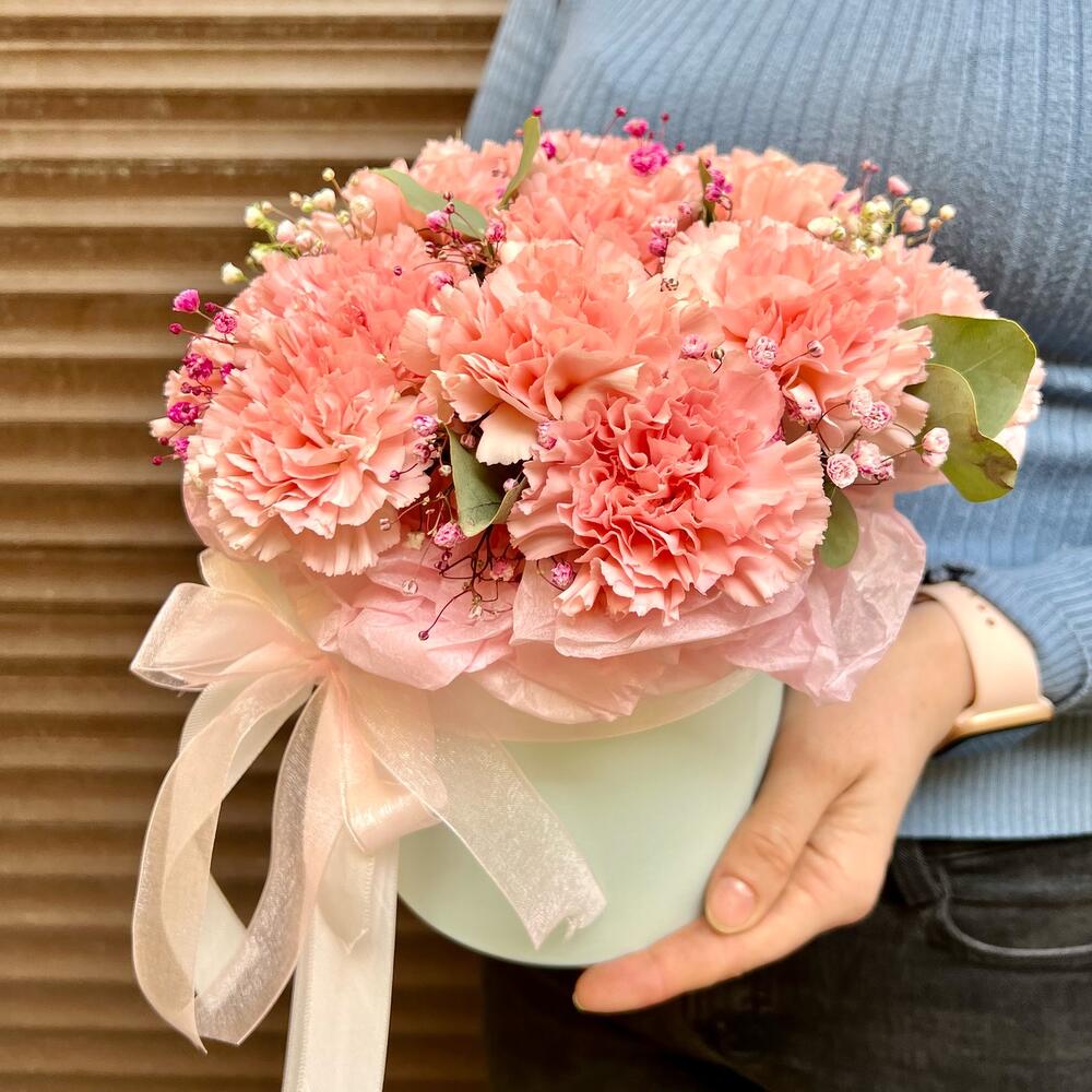 Эвкалипт – 5 шт.Оазис флористический – 1 шт.Диантус сортовой – 13 шт.Гипсофила розовая – 1 шт.коробка шляпная s – 1 шт.