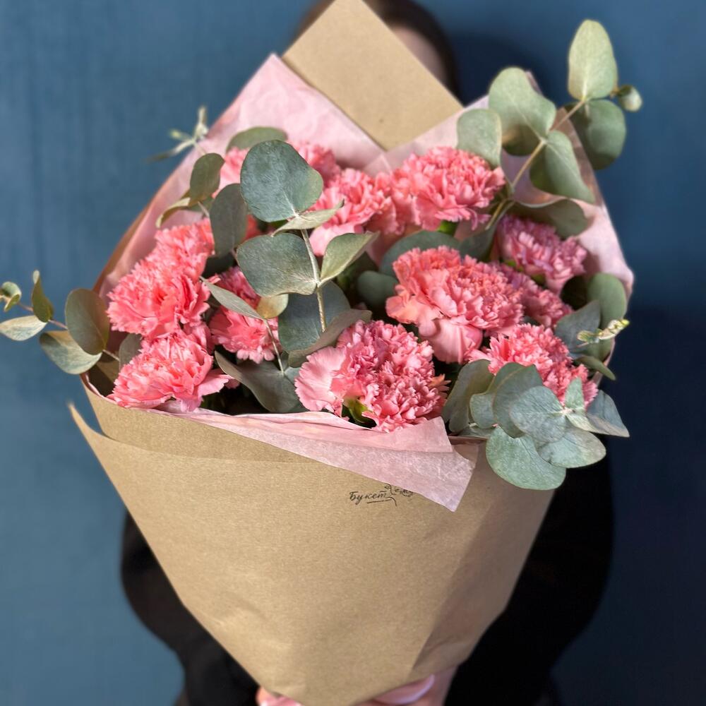 Эвкалипт – 1 шт.Лента атласная – 1 шт.Тишью – 2 шт.Диантус – 11 шт.Крафт – 1 шт.