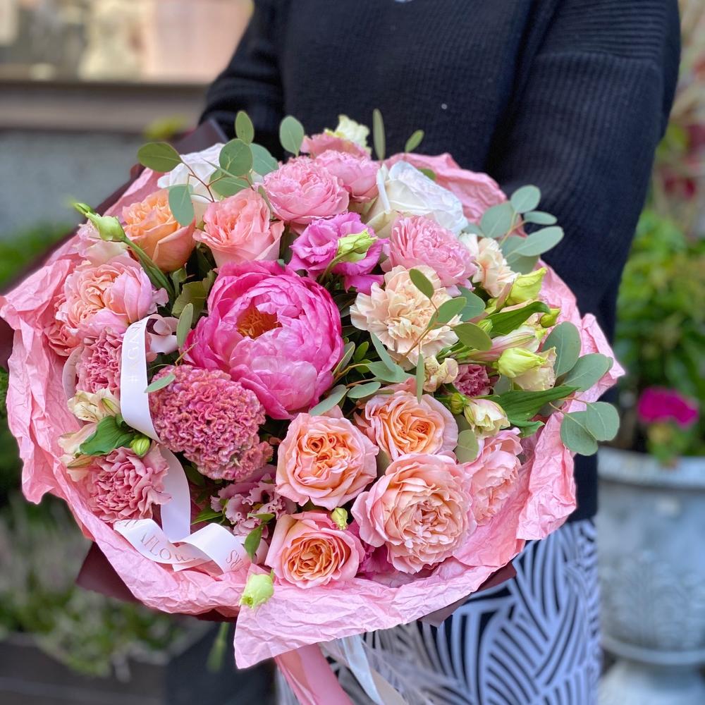 Альстромерия – 3 шт.Лизиантус – 4 шт.Пион – 1 шт.Эвкалипт – 4 шт.Диантус – 7 шт.Роза пионовидная кустовая – 3 шт.Роза пионовидная – 7 шт.Атласная лента – 2 шт.Дизайнерская упаковка – 2 шт.