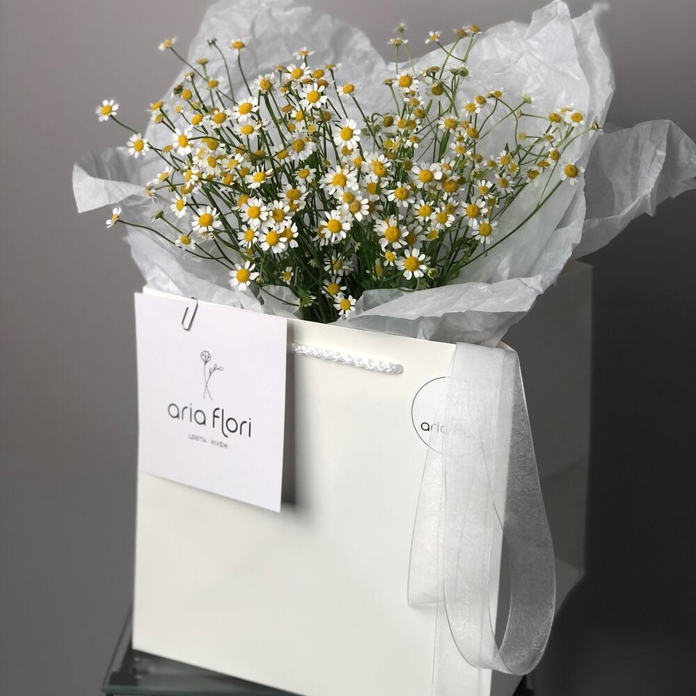 Мелкие Ромашки – всегда заряжают позитивным настроением, простота и легкость в этом цветке:3Стильная упаковка в сумку/пакет придало ей шарма и удобства в транспортировке