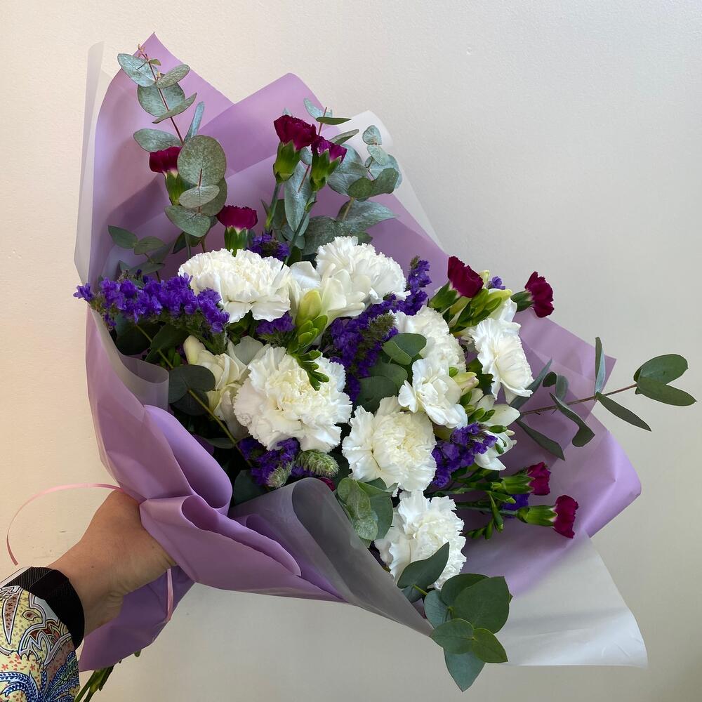 Гвоздика белая – 7 шт.Гвоздика кустовая – 5 шт.фрезия ароматная белая голландия – 6 шт.Зелень – 5 шт.Статица синяя – 4 шт.Упаковка с атласной лентой – 5 шт.