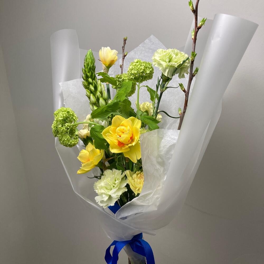 Вибурнум – 1 шт.Нарцисс – 3 шт.Гвоздика – 5 шт.Орнитогалум – 1 шт.Гвоздика кустовая – 1 шт.Прунус – 2 шт.