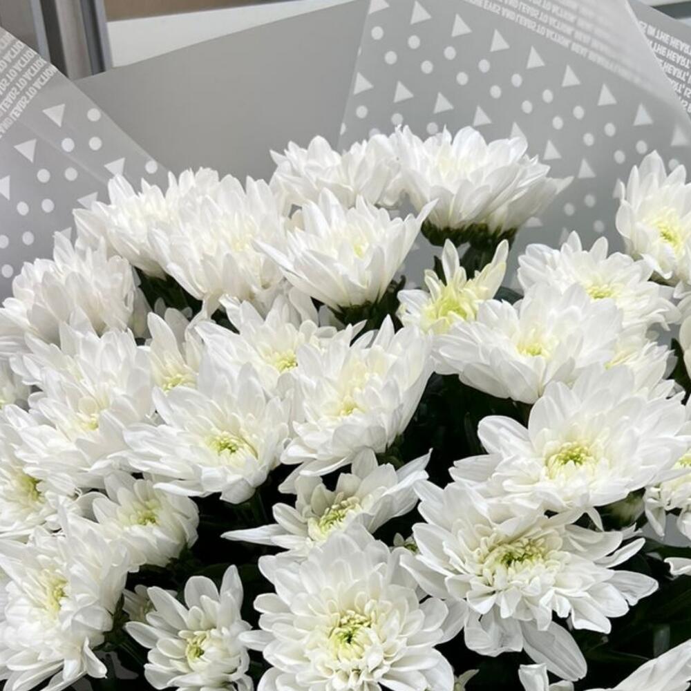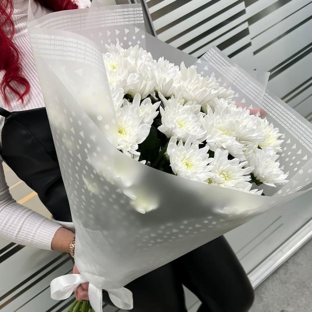 Упаковка – 2 шт.Лента атласная – 1 шт.Хризантема кустовая белая – 9 шт.