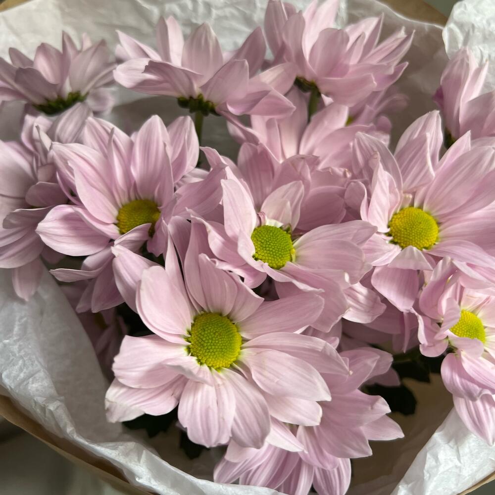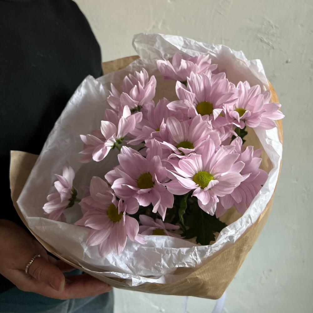 Хризантема кустовая – 3 шт.Лента атласная – 2 шт.Упаковка дизайнерская – 2 шт.