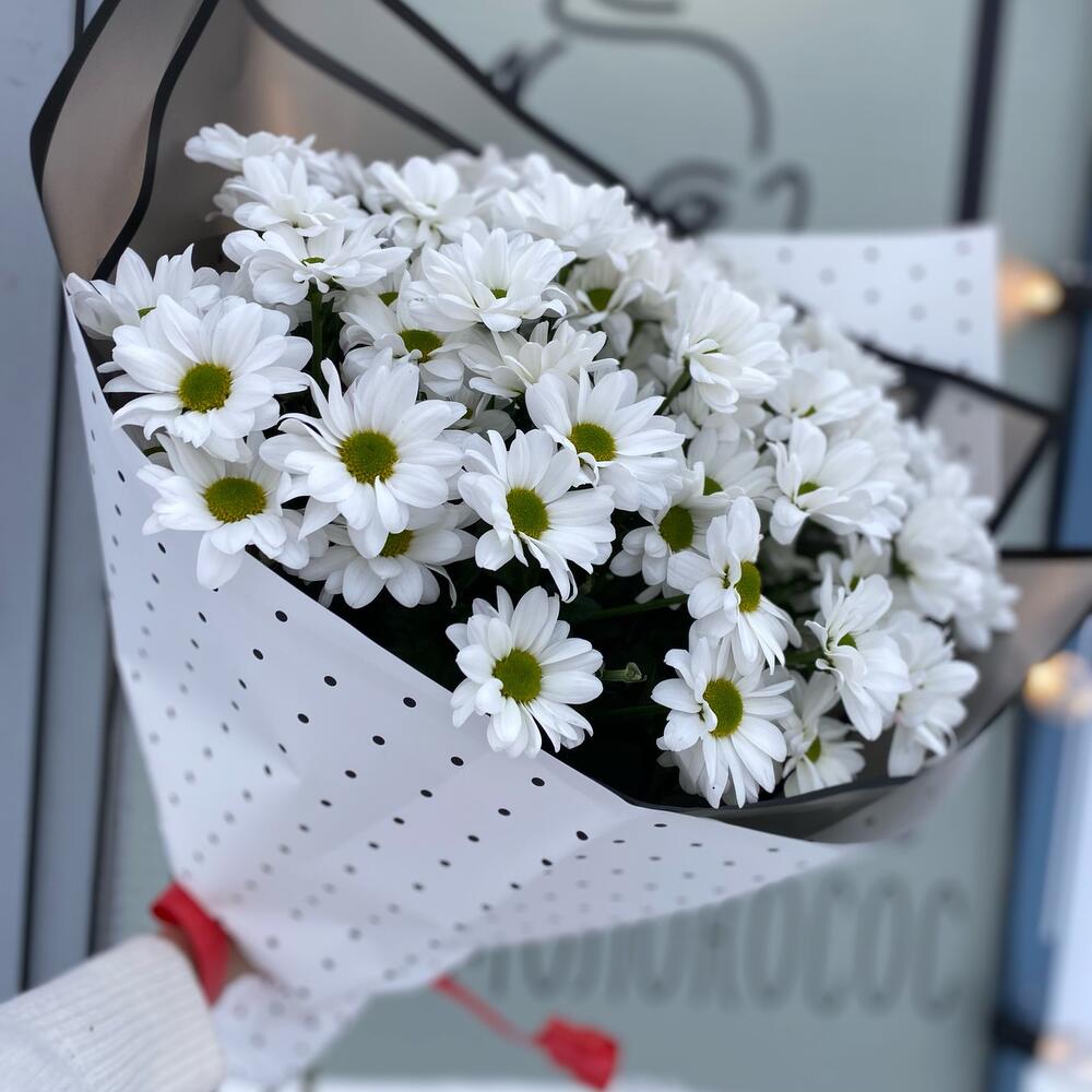 Хризантема кустовая – 9 шт.Упаковка дизайнерская – 2 шт.Лента – 1 шт.