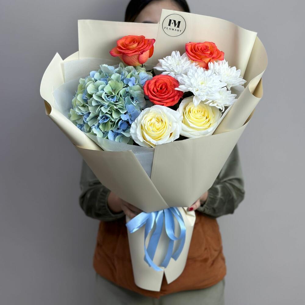 Альстромерии, Гвоздики, Кустовые розы, Лизиантусы, Розы, Хризантемы