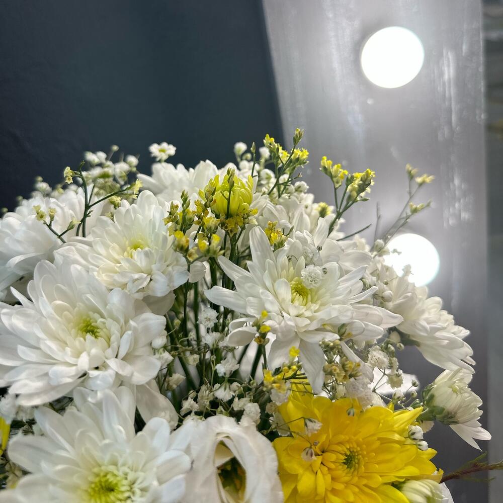 Хризантема кустовая – 7 шт.Гипсофила – 3 шт.Лимониум – 4 шт.Тишью – 3 шт.Оазис флористический – 2 шт.Коробка шляпная – 1 шт.
