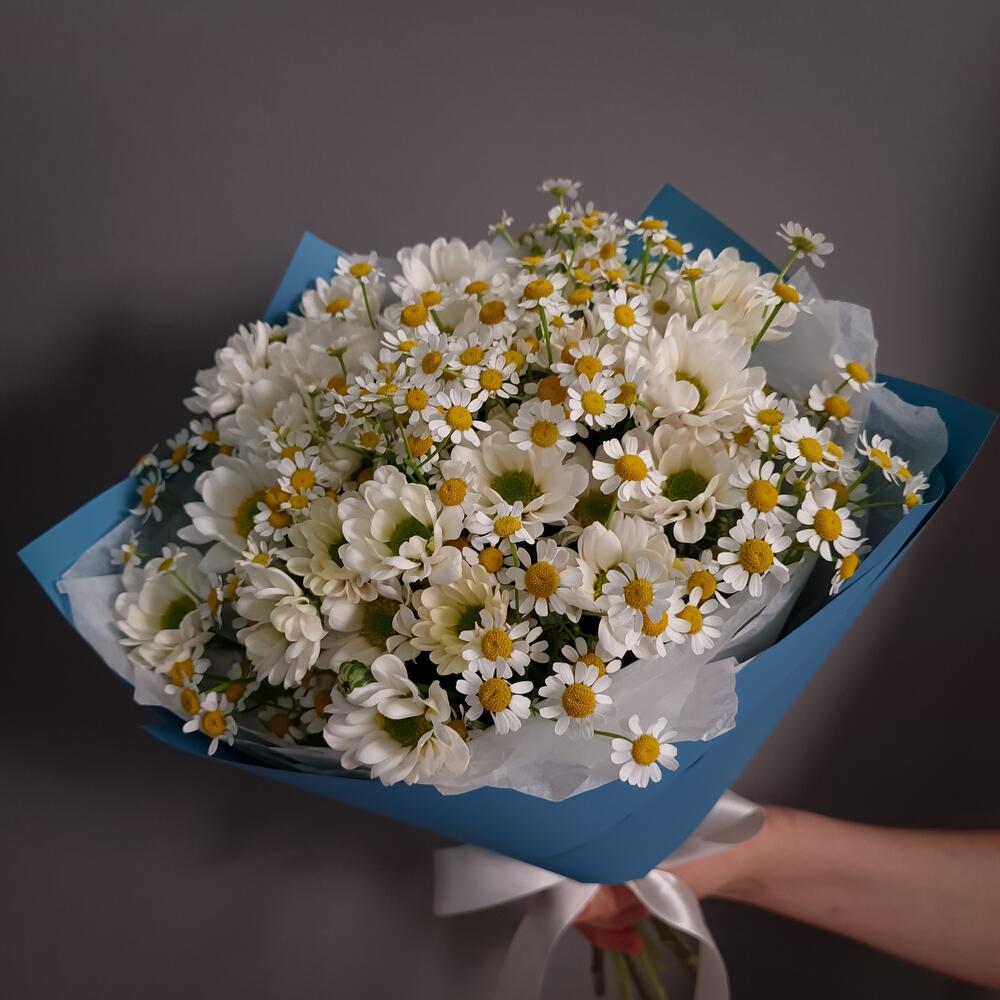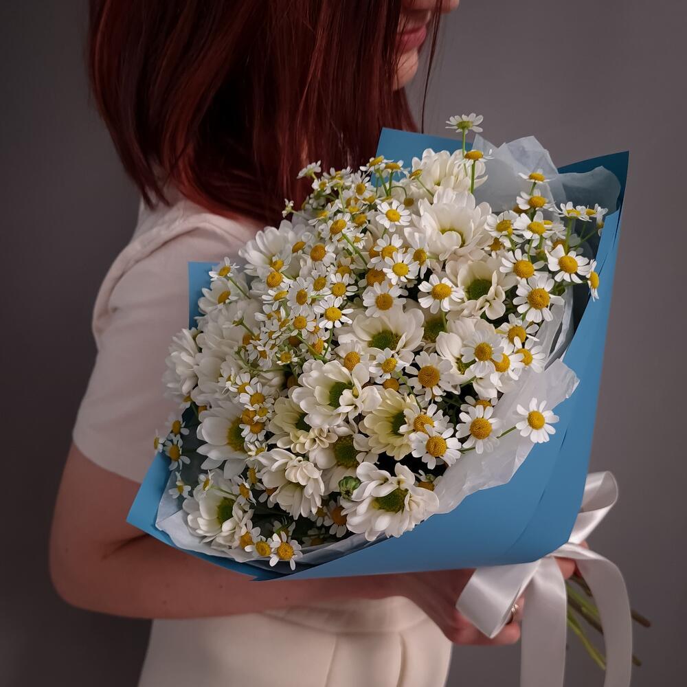 Упаковка дизайнерская – 1 шт.Аквапак – 1 шт.подкормка для срезанных цветов – 2 шт.ромашки кустовые – 6 шт.хризантема сантини росси вайт – 5 шт.