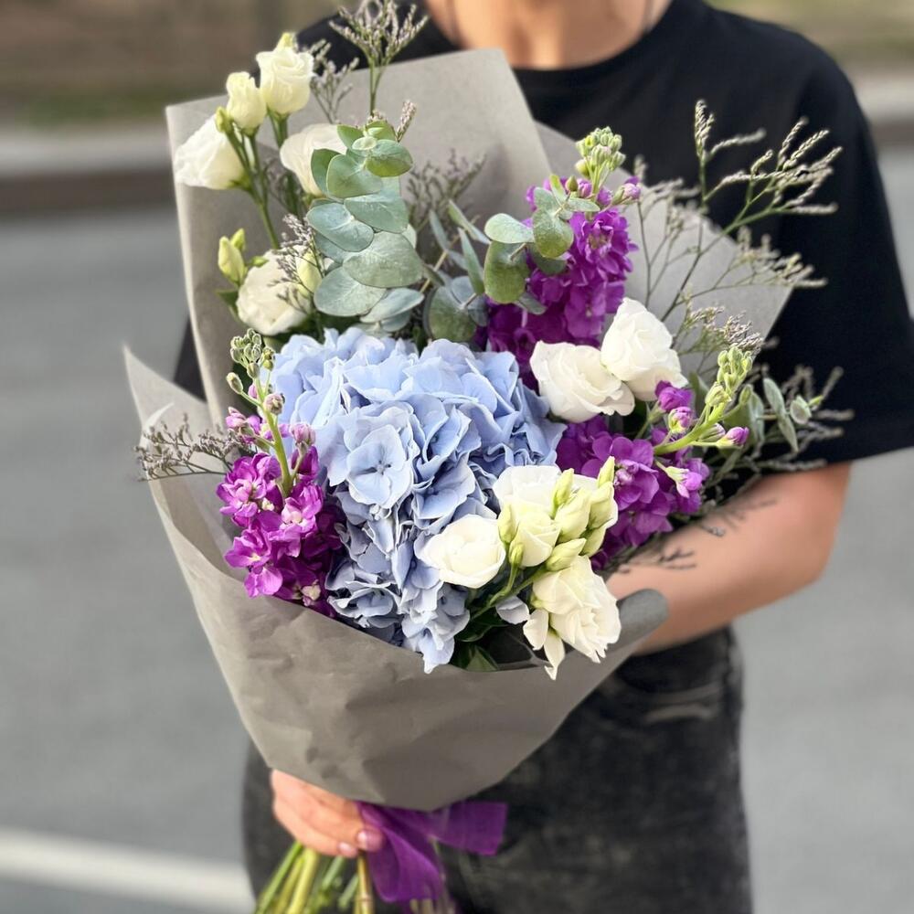 Гортензия – 1 шт.Маттиола – 3 шт.эустома кустовая – 3 шт.Лимониум – 2 шт.эвкалипт кустовой – 3 шт.Упаковка дизайнерская – 1 шт.Лента атласная – 1 шт.