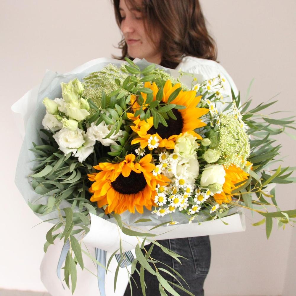 Яркий солнечный букет с ромашками, подсолнухами, лизиантусом и травами.Стильное цветочное решение для любого случая