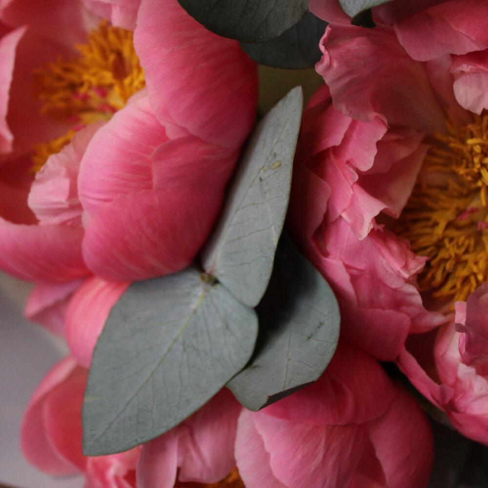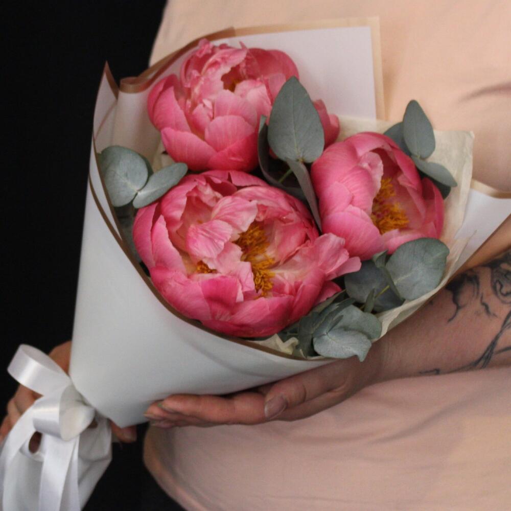 Эвкалипт – 2 шт.Лента атласная – 2 шт.Тишью – 1 шт.Пленка матовая – 1 шт.Пион коралл шарм – 3 шт.