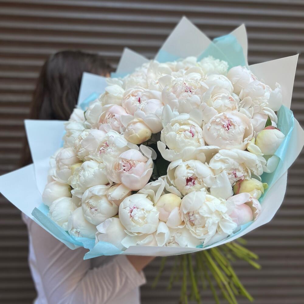 Лента атласная – 2 шт.Пион белый – 51 шт.Дизайнерская упаковка – 3 шт.