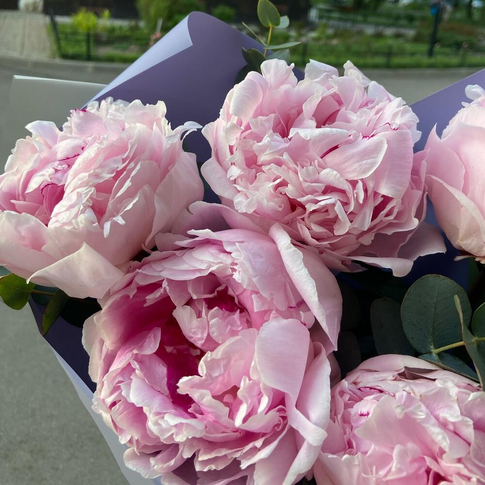 Пион – 5 шт.Эвкалипт – 5 шт.Упаковка дизайнерская – 1 шт.