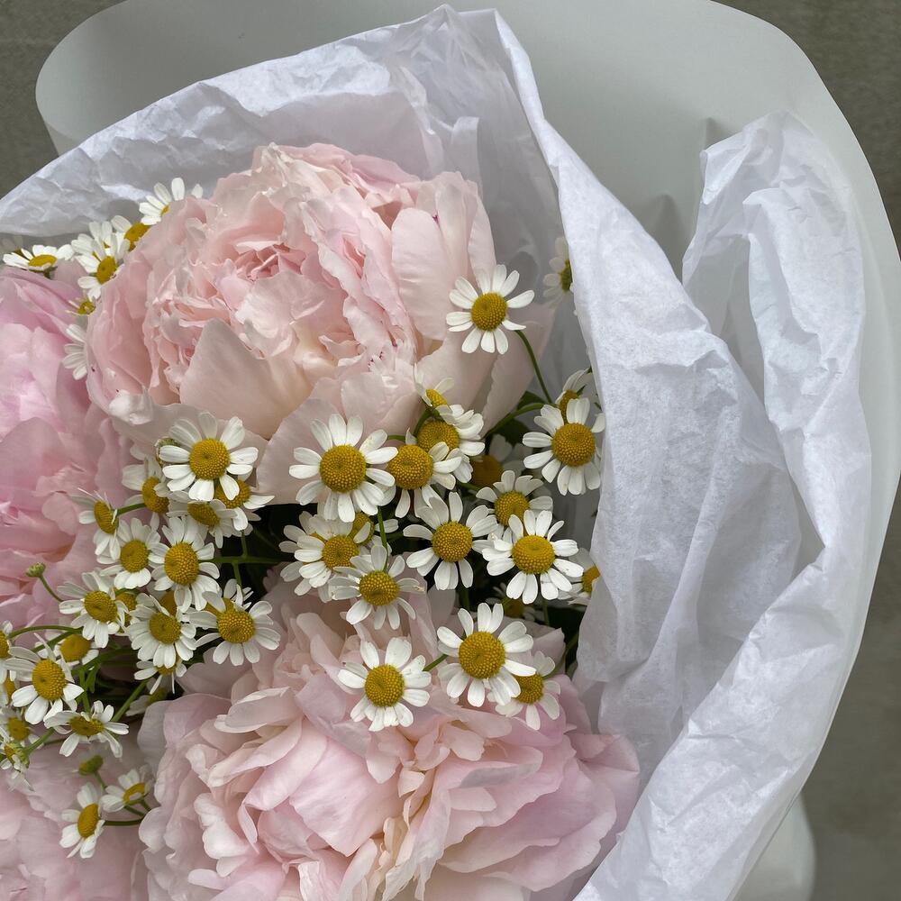 Пион – 5 шт.Танацетум – 4 шт.Упаковка дизайнерская – 1 шт.
