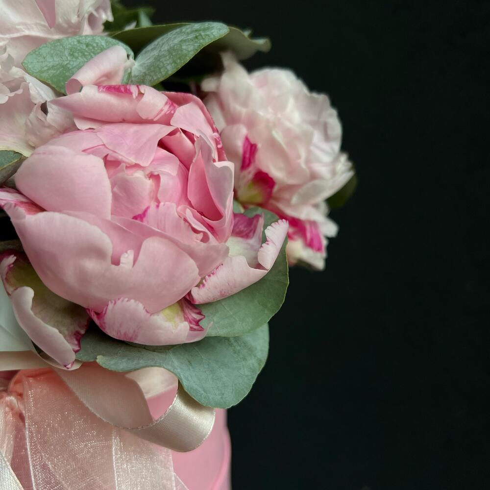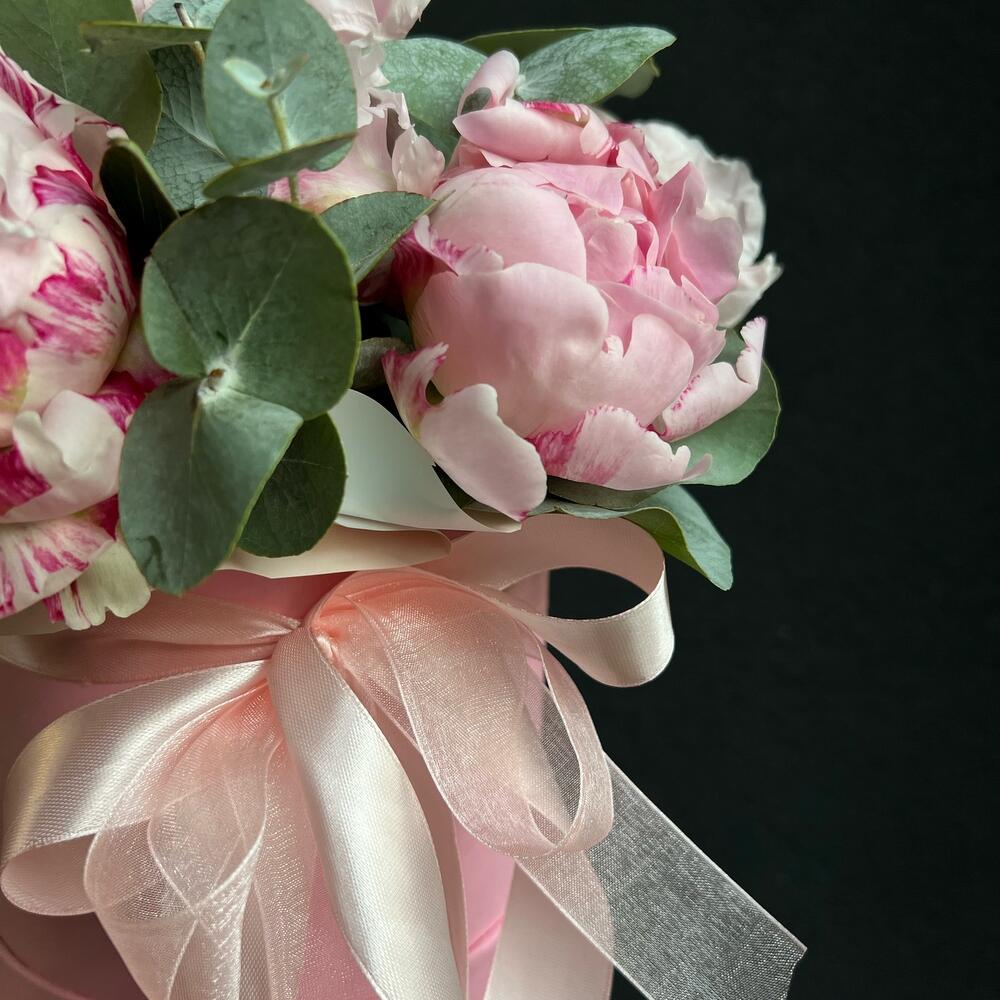 Коробка шляпная – 1 шт.Флористическая губка (оазис) – 1 шт.пионы – 5 шт.Эвкалипт – 5 шт.Атласная лента – 1 шт.
