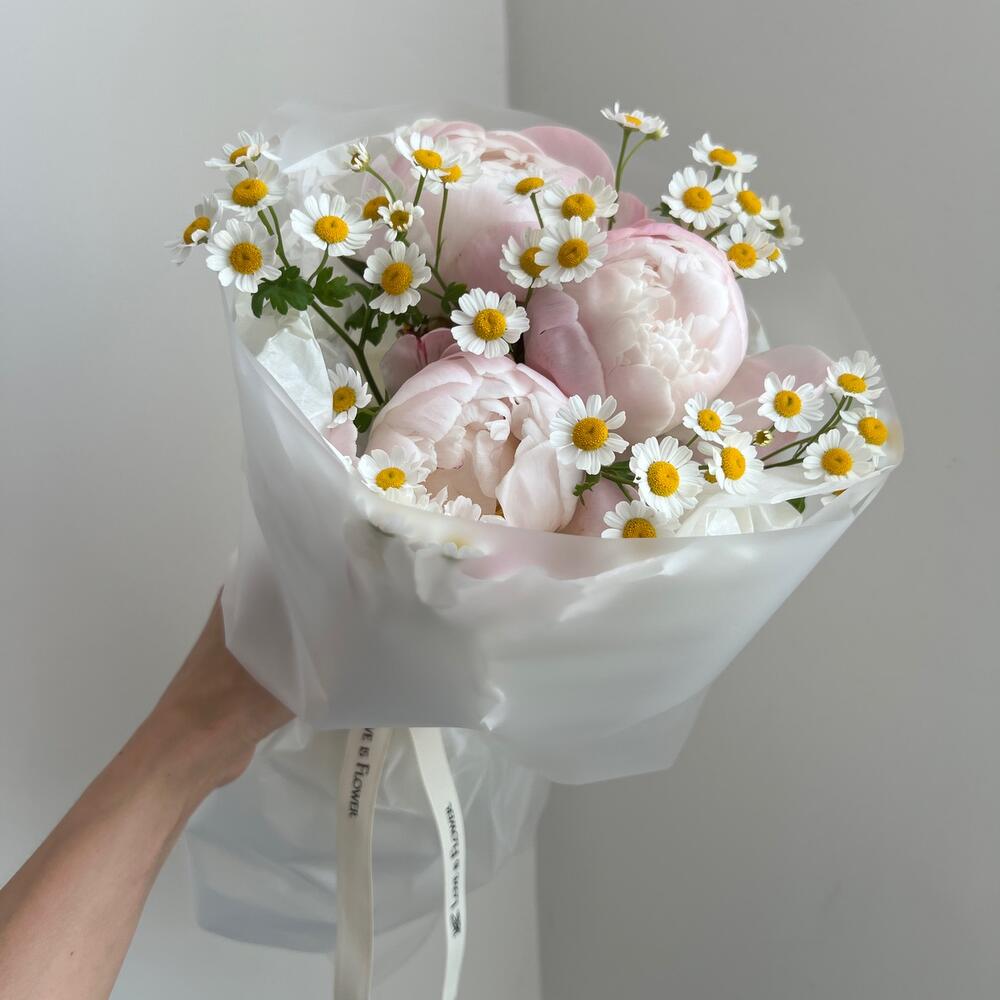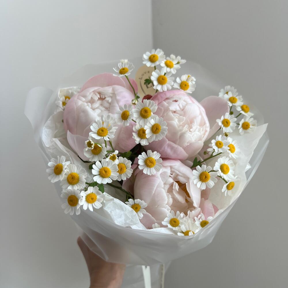 Очарование изысканного пиона и простоты ромашки, даёт особую изюминку этому букету. Не одна девушка не останется без впечатлений☺️Инструкция по уходу:• Храните букет в прохладных местах в дали от батарей и прямого солнечного света.• Поместите букет в вазу с холодной водой, для продления жизни цветка.• Меняйте воду в вазе каждый день и обрезайте 2 сантиметра от стебля под углом 45 градусов. • Наслаждайтесь легким ароматом цветов дома!