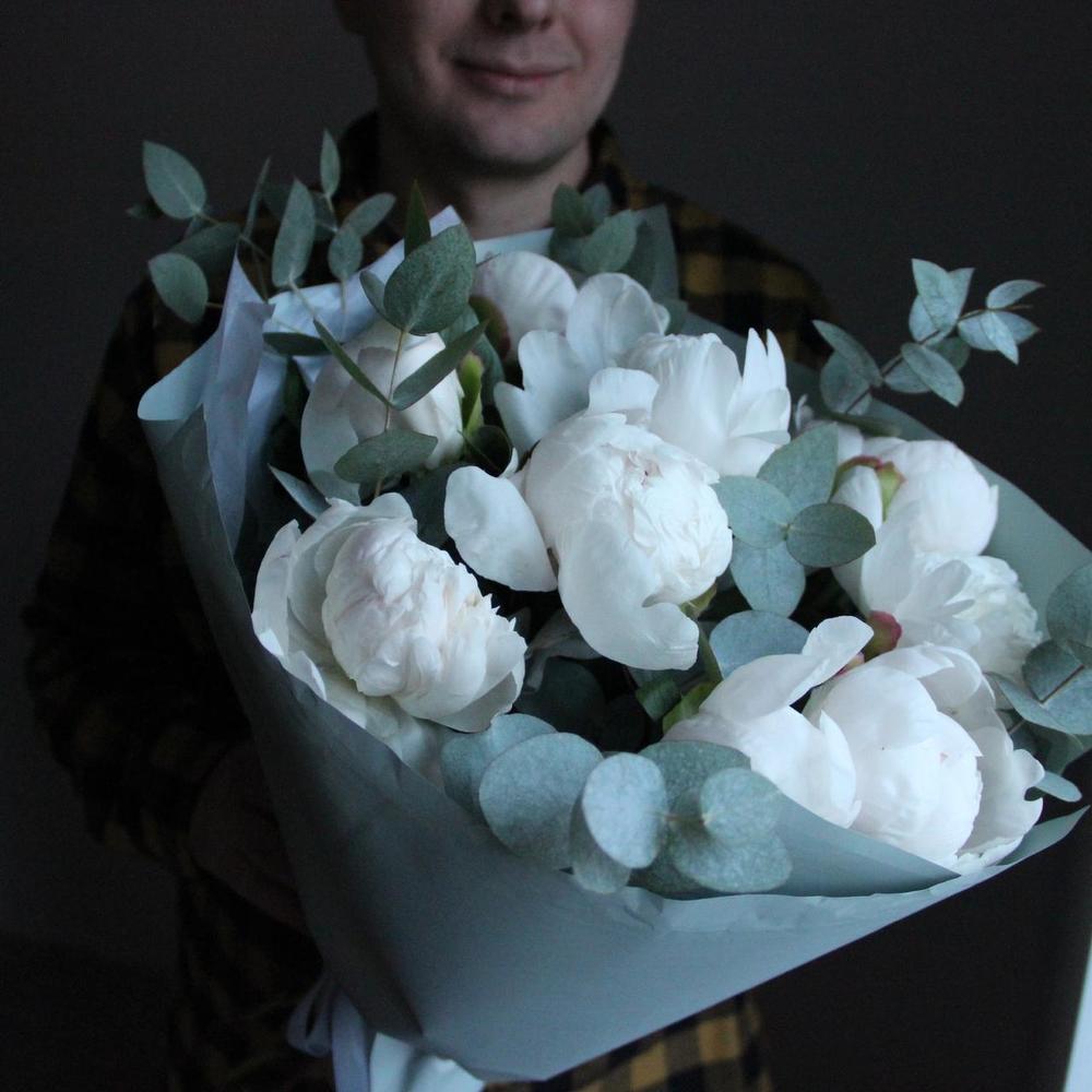 Моно букет из девяти белых пионов, с веточками эвкалипта, в лаконичной упаковке.Стильное цветочное решение для любого случая.
