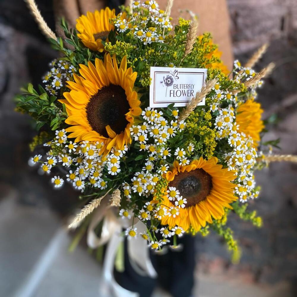 Букет из подсолнухов, матрикарии и солидаго “Рик Робертс”
