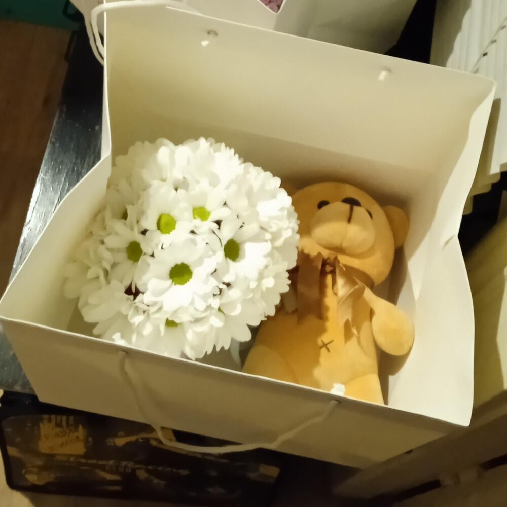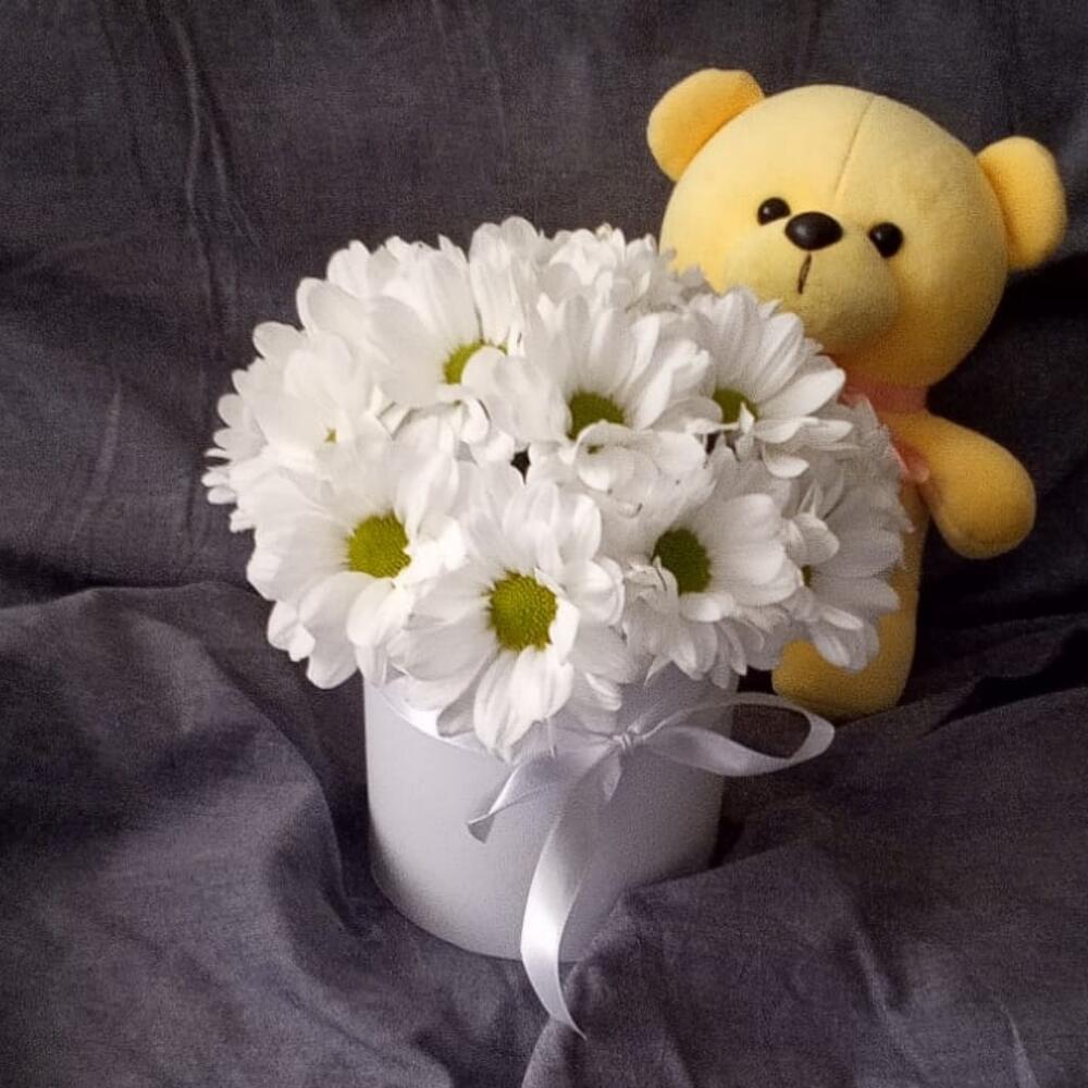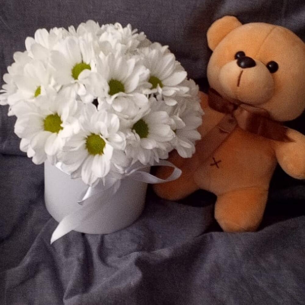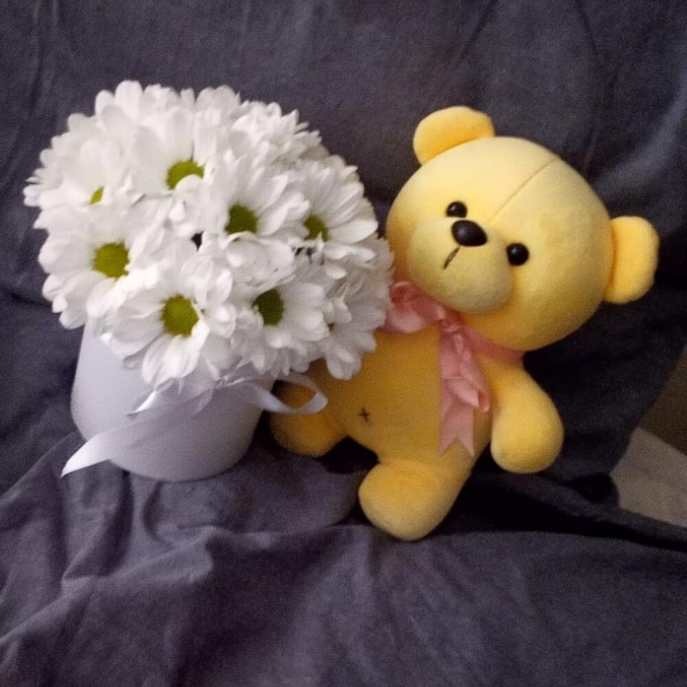 Ромашка – 17 шт.Лента атласная – 1 шт.Шляпная коробка – 1 шт.Мишка плюшевый – 1 шт.Флористическая губка – 1 шт.Подарочный пакет – 1 шт.