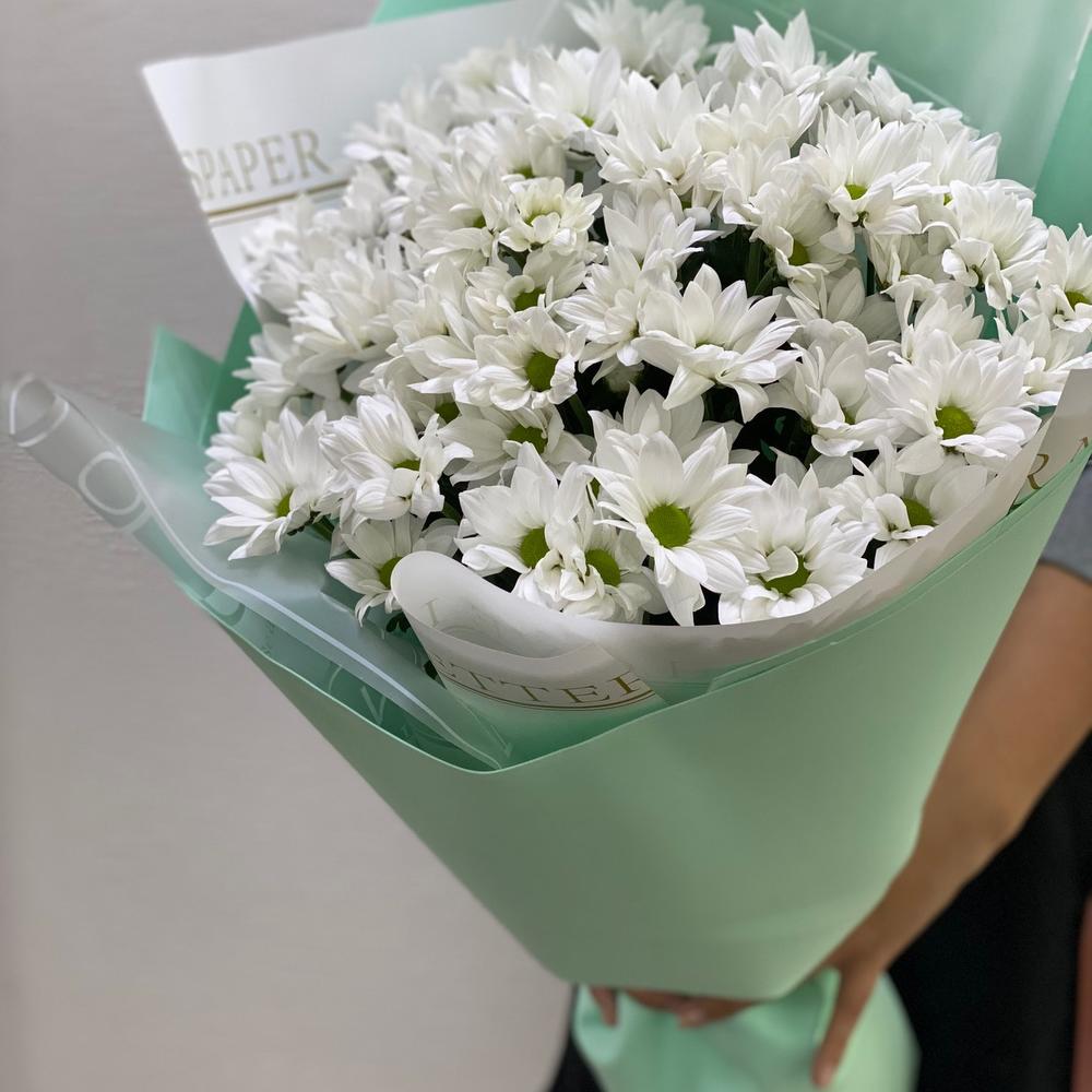 Самые популярные и любимые цветы- ромашки!Ни одна дама не остаётся к ним равнодушной!А стременная упаковка премиального качества и родного мятного оттенка- только добавляет изюминку этим романтичным цветам!