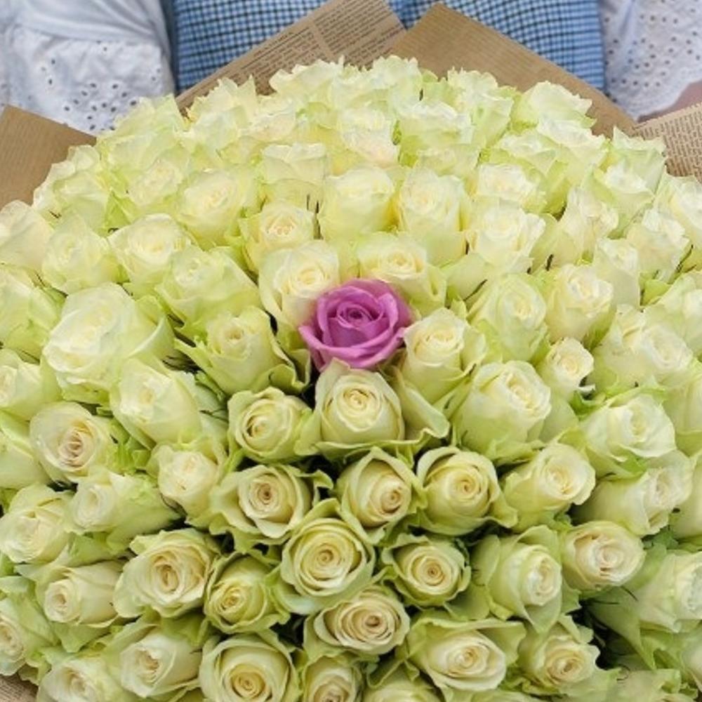 Роза Россия 50 см – 101 шт.Крафт – 3 шт.Лента атласная – 1 шт.