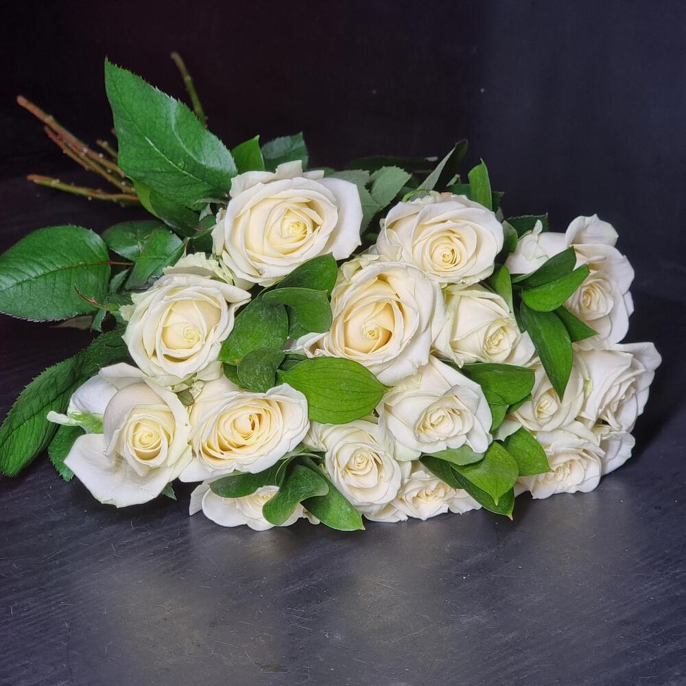 Роза аваланж россия – 15 шт.Рускус сочи – 3 шт.Пленка прозрачная – 1 шт.Лента атласная – 1 шт.