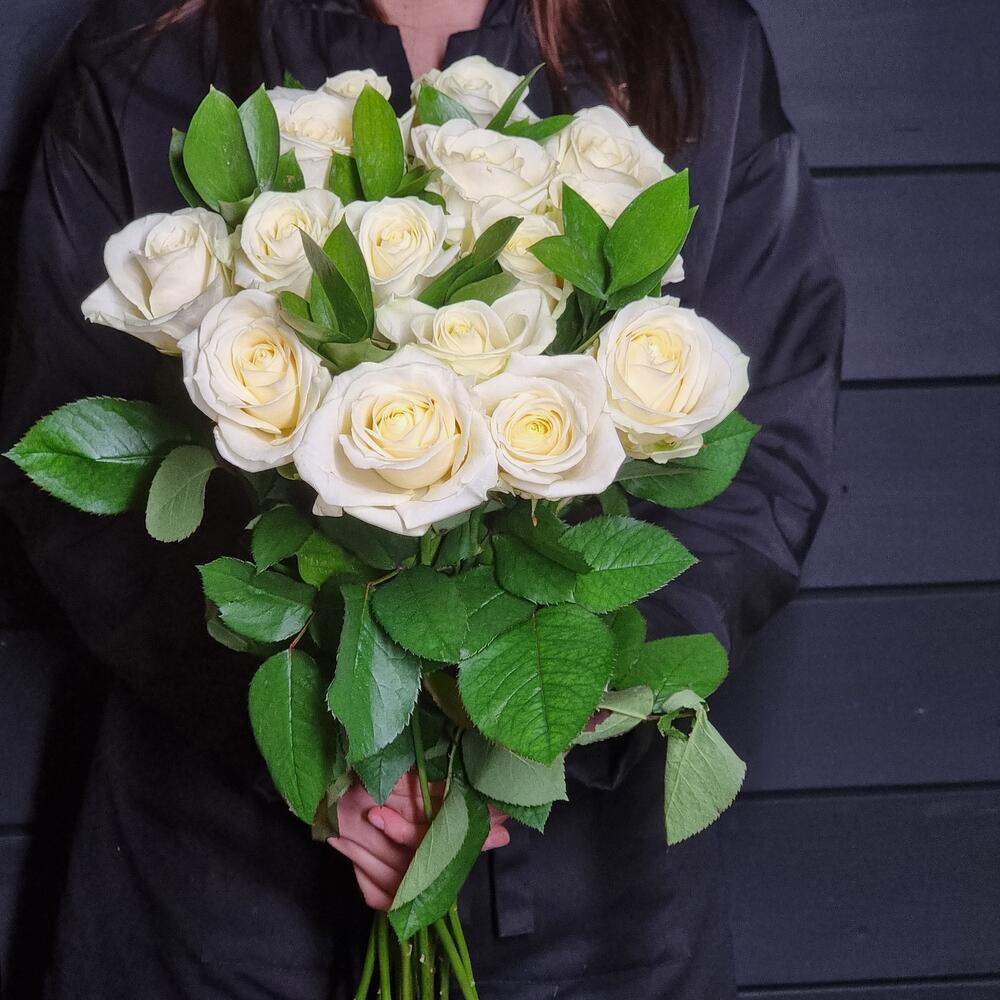 15 роз аваланш с рускусом в букете