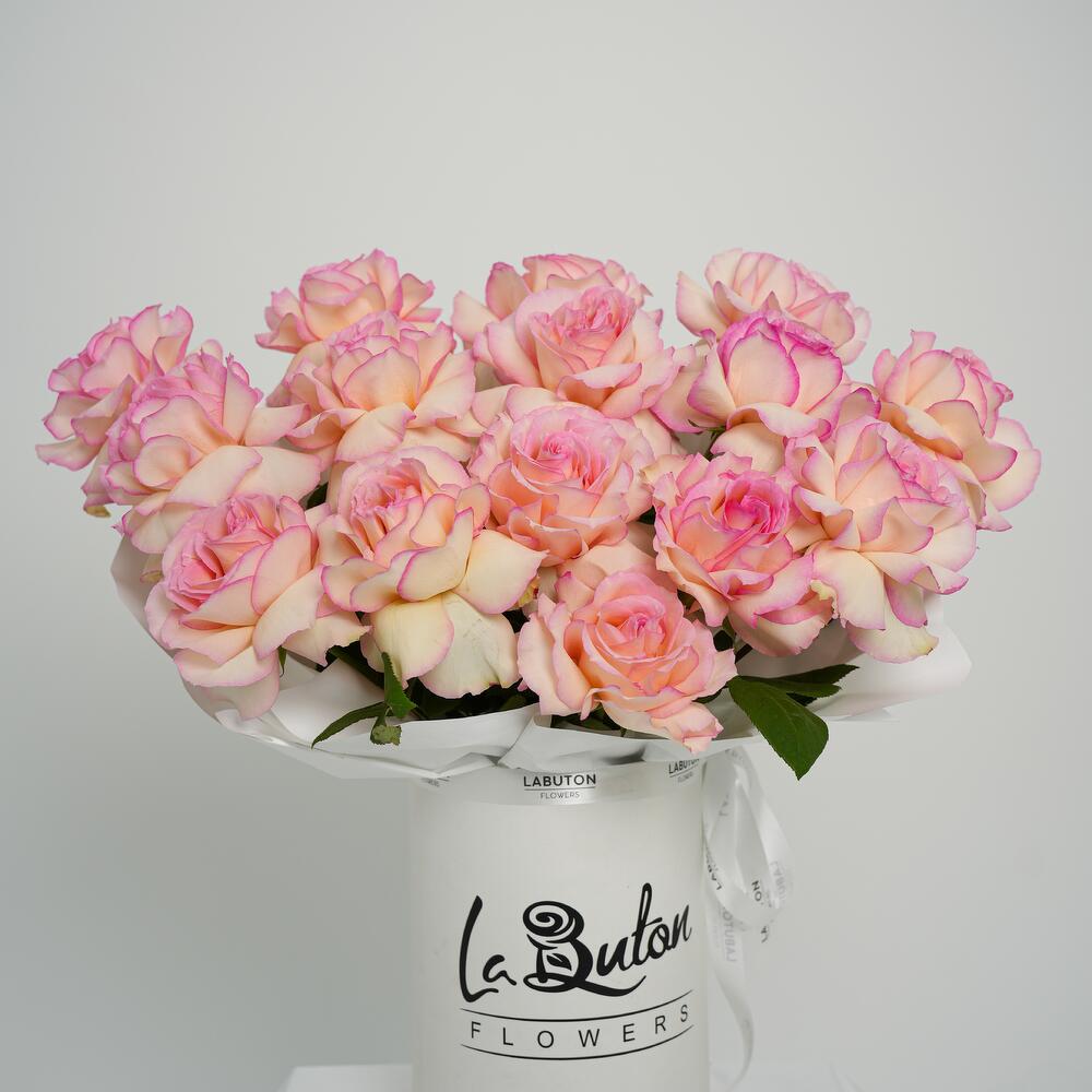 Роза – 15 шт. Лента атласная – 1 шт. Оазис – 2 шт. коробка "m" – 1 шт.