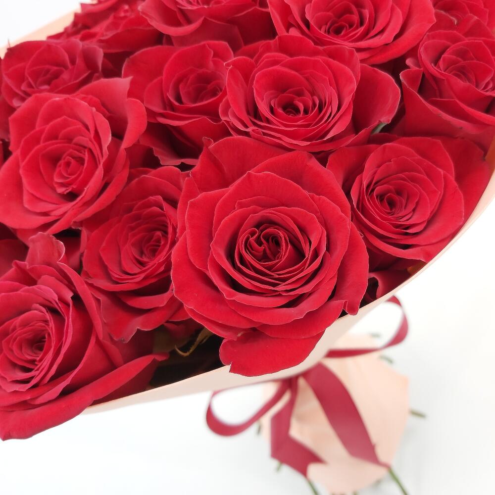 Стильный монобукет из 25 красных роз с оформлением – это классика, которая будет по нраву каждой девушке.