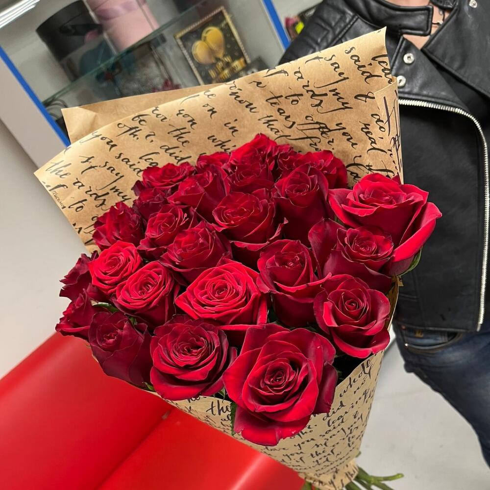 розы 60 см эквадор – 25 шт.Лента атласная – 1 шт.Крафт упаковка – 1 шт.