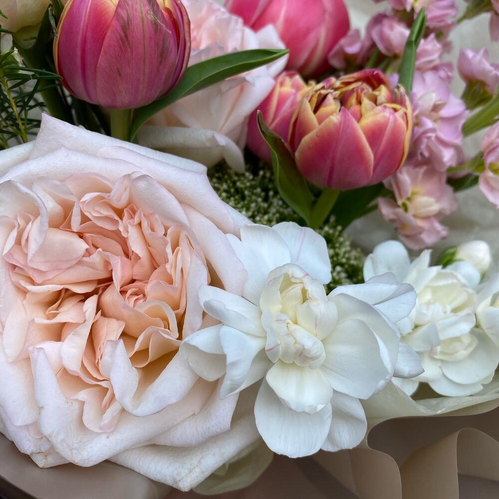 роза пинк охара(ароматная) – 3 шт.Пион Коралл Шарм (Coral Charm) – 1 шт.пионовидный тюльпан коламбус – 3 шт.Маттиола – 2 шт.Трахелиум – 1 шт.Диантус кустовой – 2 шт.Хамелациум белый – 1 шт.Упаковка дизайнерская – 3 шт.Лента атласная – 1 шт.