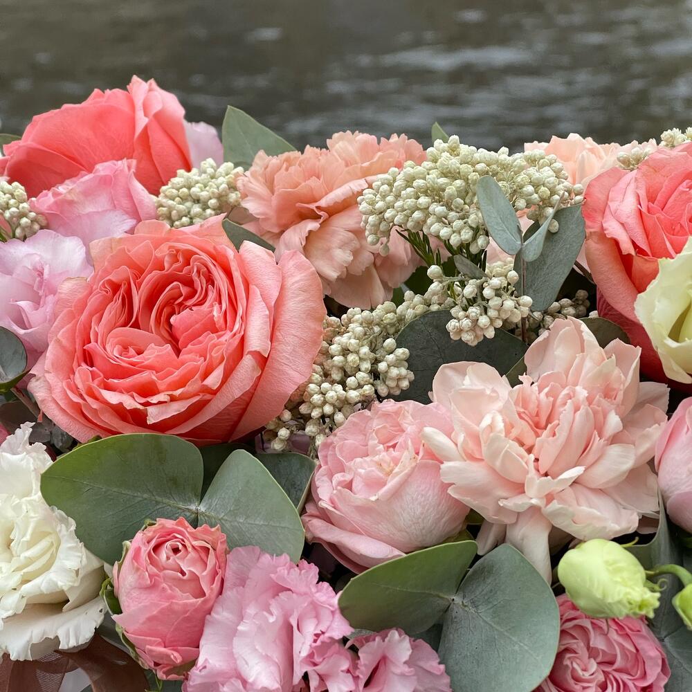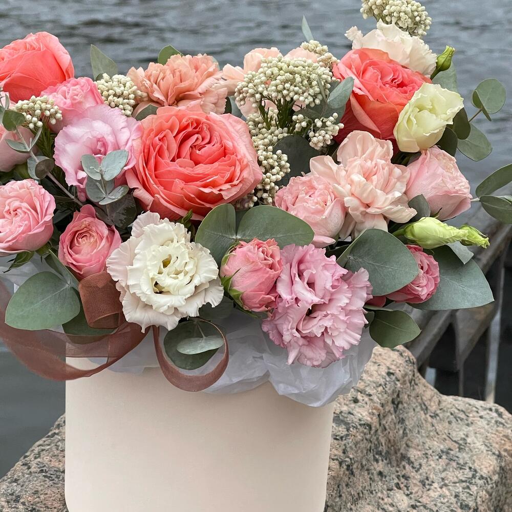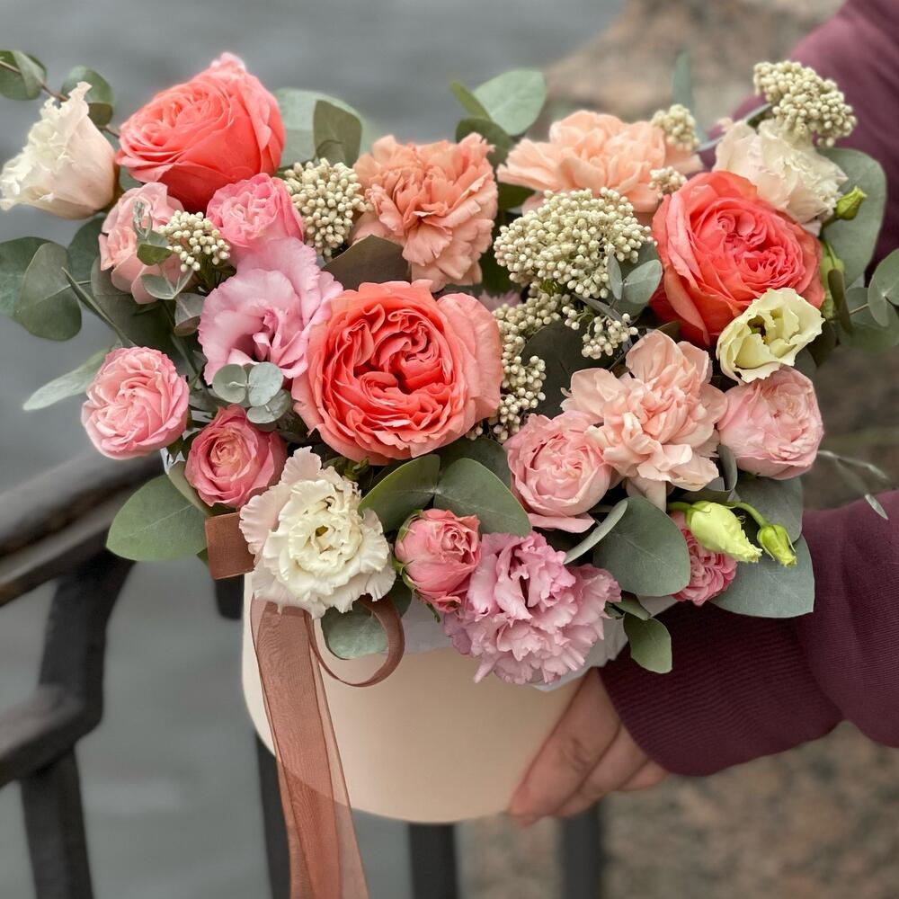 Роза пионовидная кахала – 3 шт.Роза кустовая пионовидная мадам бомбастик – 2 шт.эустома розовая махровая – 2 шт.Диантус – 3 шт.Озотамнус – 2 шт.Эвкалипт – 3 шт.Оазис флористический – 1 шт.Коробка шляпная – 1 шт.