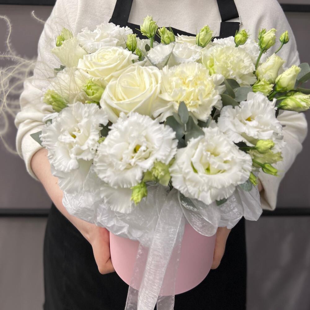 роза пионовидная плайя бланка – 3 шт.эустома махровая белая – 3 шт.Диантус – 3 шт.Эвкалипт – 2 шт.Оазис флористический – 1 шт.Коробка шляпная – 1 шт.Лента атласная – 2 шт.Тишью – 1 шт.Ковыль – 1 шт.