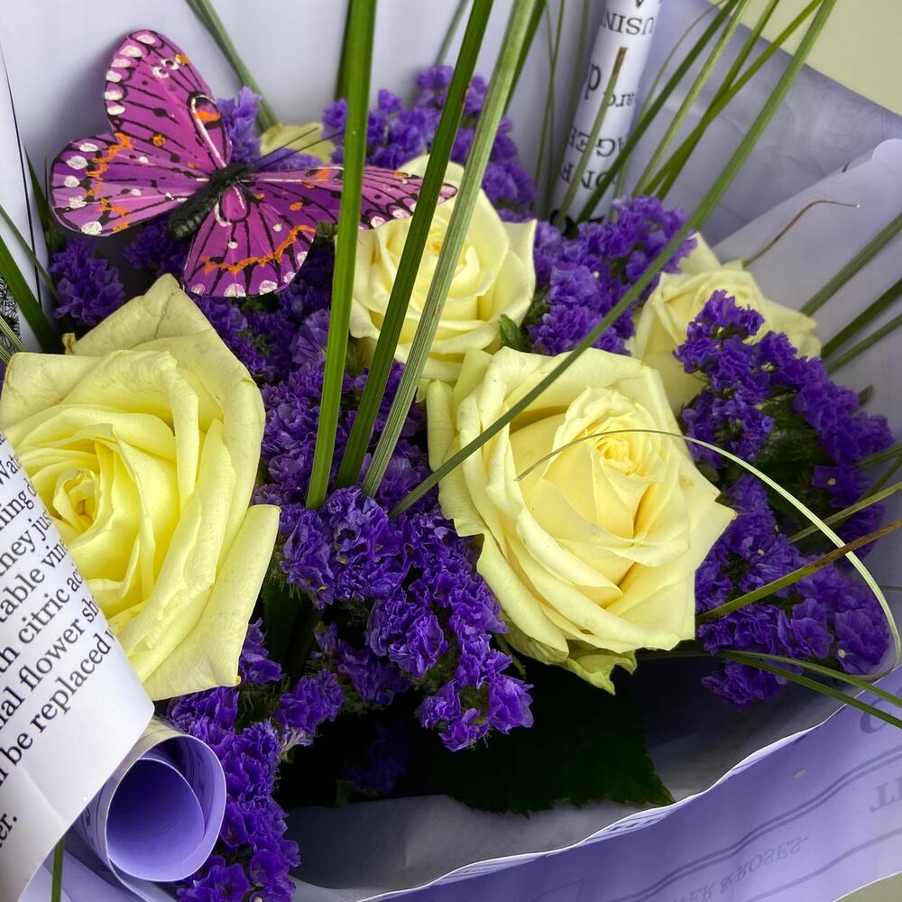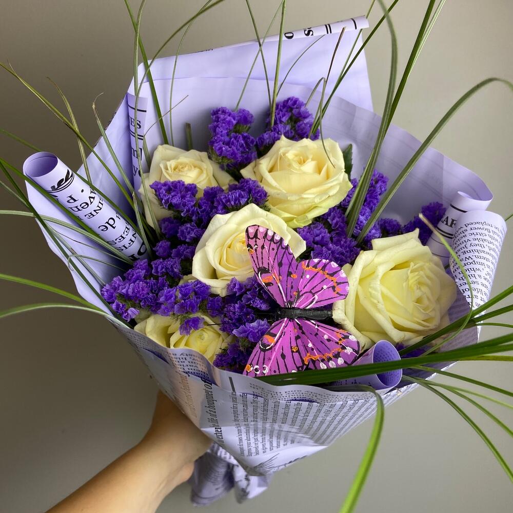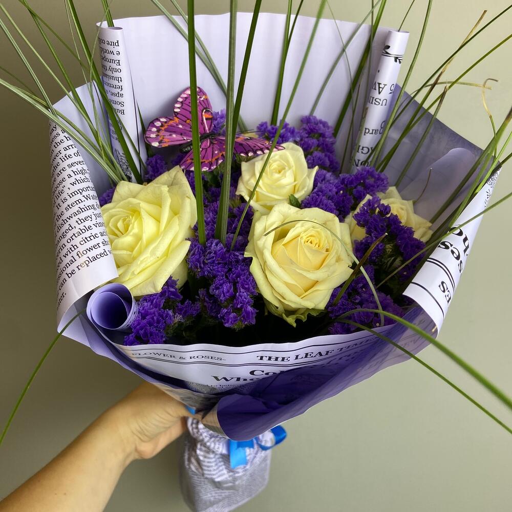 Роза одноголовая – 5 шт.Статица – 5 шт.зелень пучок – 1 шт.Декор бабочка – 1 шт.Упаковка дизайнерская – 1 шт.