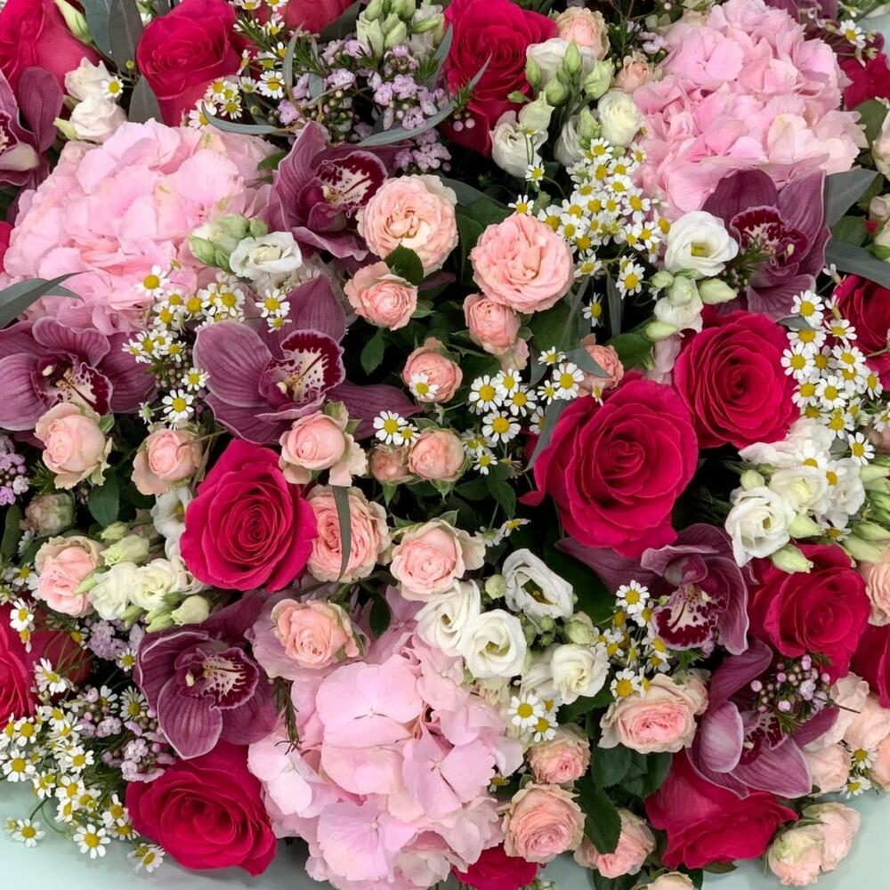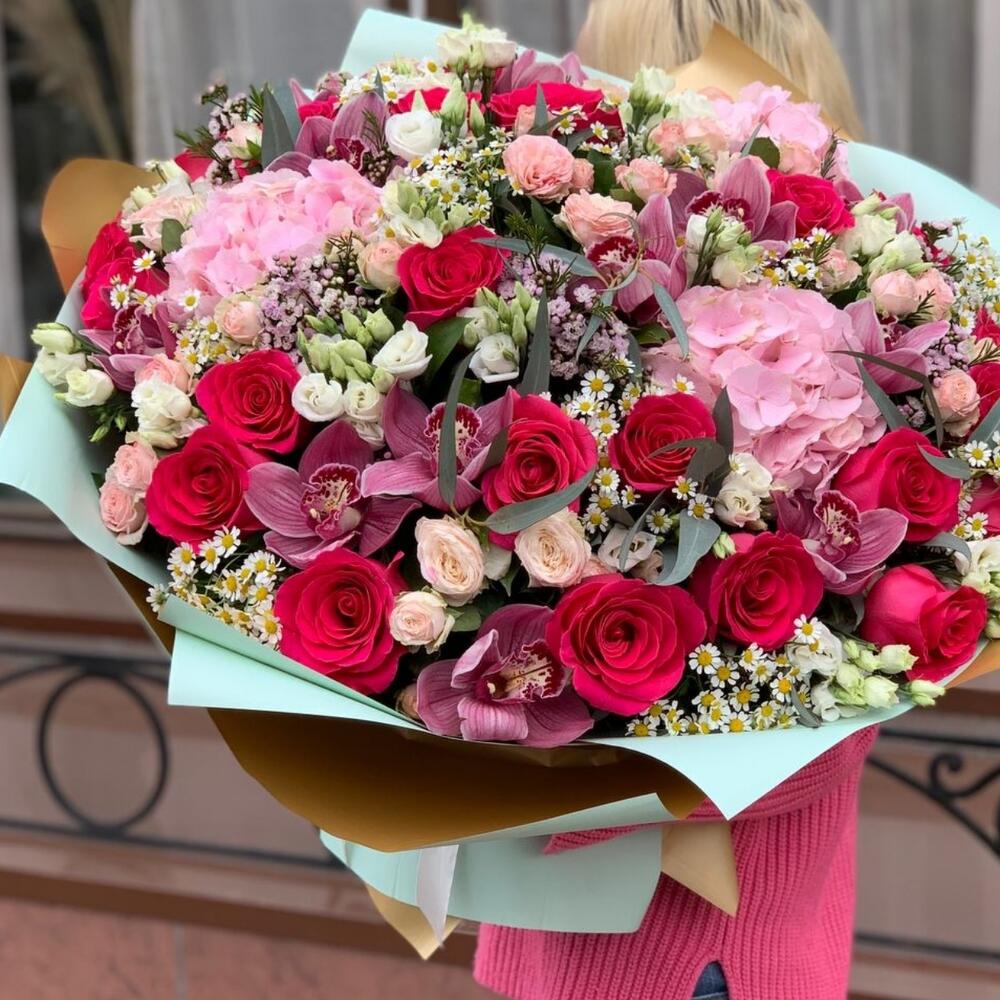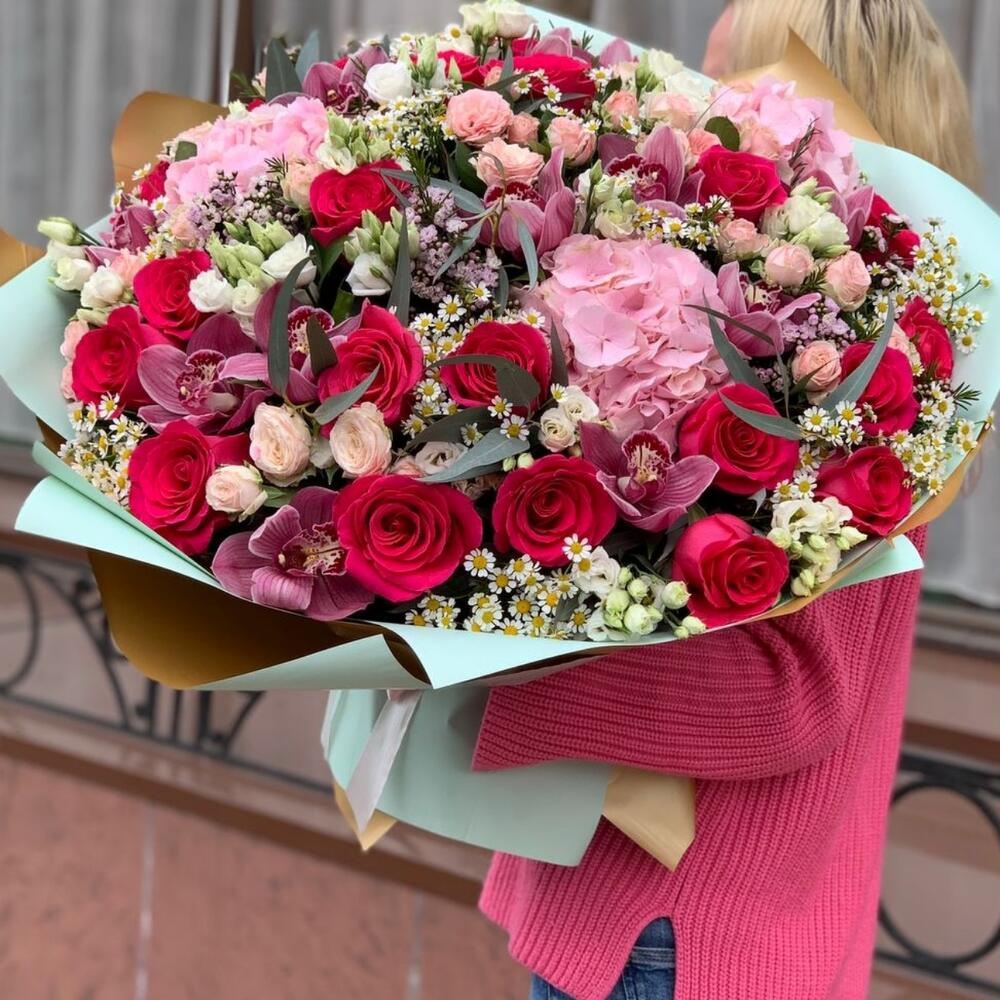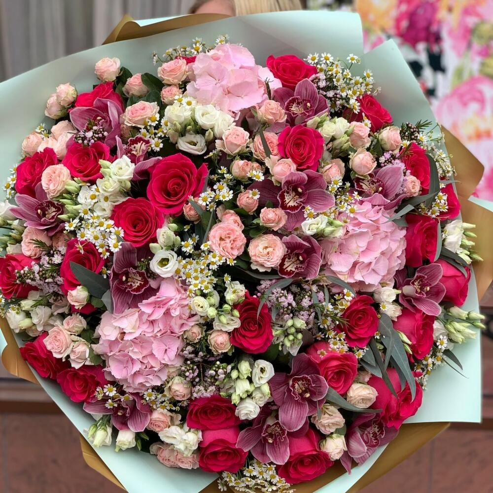 Альстромерии, Гортензии, Кустовые розы, Лизиантусы, Розы, Хризантемы